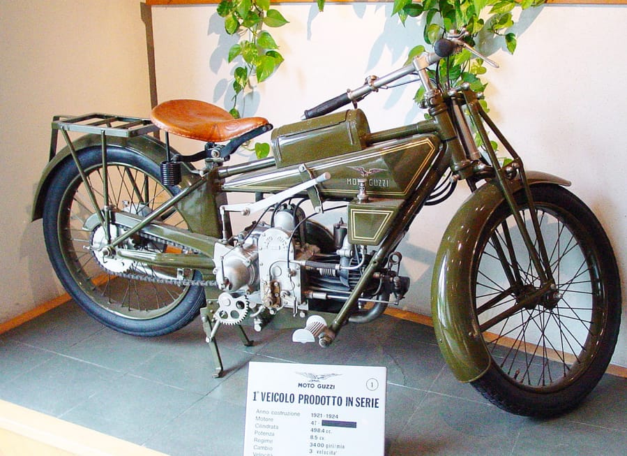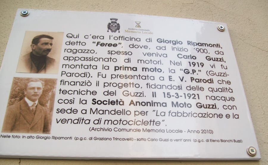 Un’amicizia nata durante la Prima Guerra Mondiale quella tra il maresciallo motorista Carlo Guzzi (Milano, 1889-Davos, Svizzera, 1964), di padre ingegnere, e l’aviatore pluri-decorato Giorgio Parodi (Venezia, 1897-Genova 1955), figlio di armatore genovese. Con loro, l’amico pilota provetto Giovanni Ravelli; tutti e tre erano appassionati di motori e di sport motociclistici. La storia narra che Carlo Guzzi propose a Giorgio e a Giovanni il progetto di costruire una motocicletta di nuova concezione, una volta terminato il conflitto, ricevendone entusiastica adesione. Nel Dopoguerra, quei giovani ex militari diedero vita ad una straordinaria avventura imprenditoriale, che prosegue oggi con successo, a 95 anni dalla fondazione.