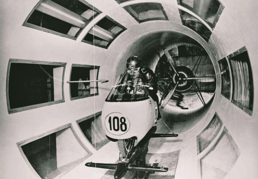 Foto storica della galleria del vento nello stabilimento Moto Guzzi di Mandello del Lario; sotto il modello custodito nel Museo MG.