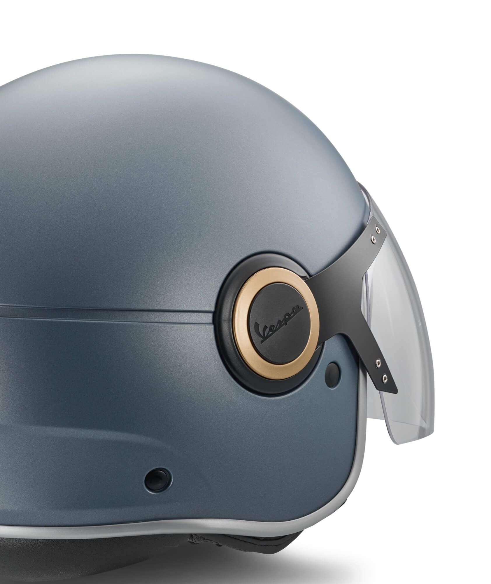 Il casco jet, proposto nella distintiva tonalità blu industriale con finitura opaca, è arricchito dal logo della serie Officina 8.