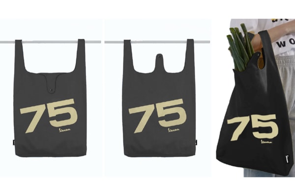 Vespa 75° shopper: borsa realizzata in materiale 100% tela di cotone; dimensioni 35x35x10cm manico 20cm; colore nero opaco; personalizzata con logo esclusivo Vespa 75 stampato su entrambi i lati.
