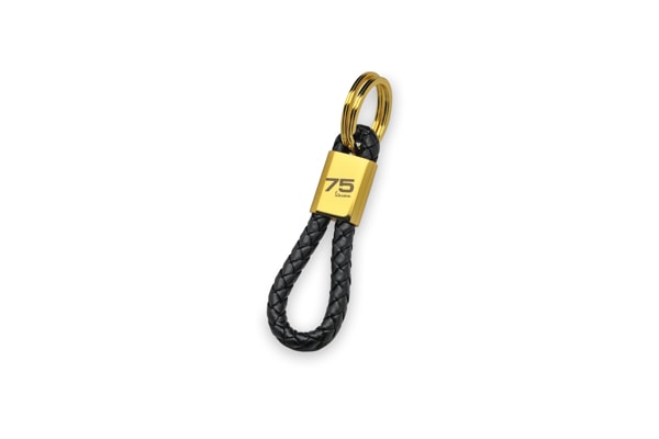 Vespa 75° keyring: portachiavi Vespa 75, realizzato in materiale intrecciato nero opaco; anello e dettaglio in acciaio color oro, dimensioni 12 centimetri, logo Vespa 75 inciso al laser.