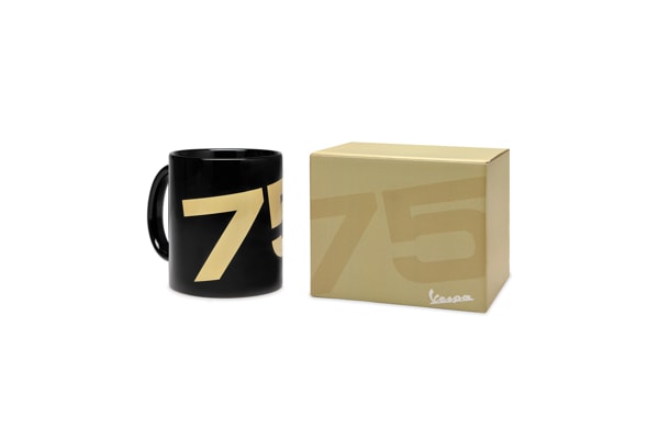 Vespa 75° mug: tazza Vespa 75, 100% ceramica, capacità 300ml, colore nero opaco all’esterno e lucido all’interno, confezionata in scatola di cartone ondulato personalizzata con logo esclusivo Vespa 75.