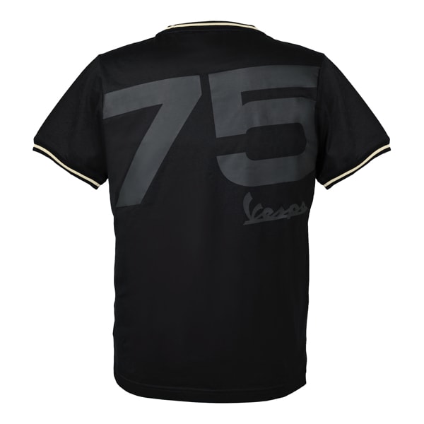 Vespa 75° t-shirt: 100% cotone con grafica water-printing; logo Vespa sul petto a sinistra, logo esclusivo 75 sulla schiena. Righe colorate in contrasto sui bordi delle maniche e sul collo. Trattamento di prelavaggio per stabilizzare il fitting. Taglie disponibili: da S a XXL.