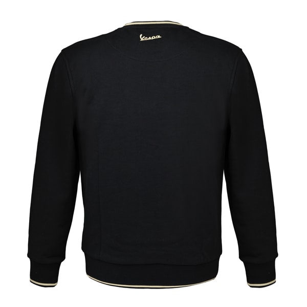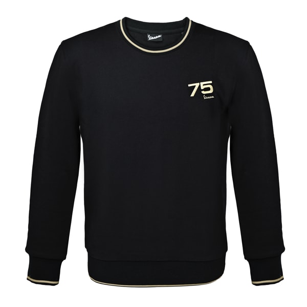 Vespa 75° fleece: felpa in cotone (non garzata), ideale per tutte le stagioni; logo esclusivo Vespa 75 sul petto a sinistra; logo Vespa sul retro del colletto; su girocollo, polsini e bordi in vita (elastici), dettaglio di stile con le righe colorate in contrasto. Taglie disponibili: da S a XXL.