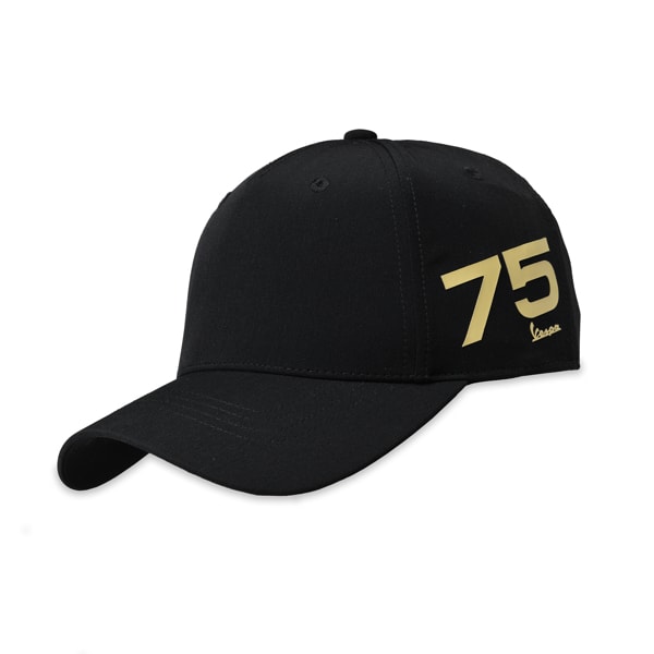 Vespa 75° hat: cappello nero in tessuto premium, con cintura di regolazione sul retro; logo Vespa – 75 e ricamato – sui due lati; taglia unica.