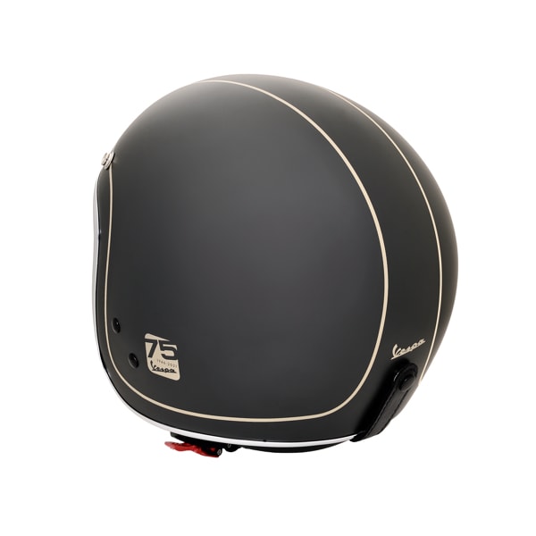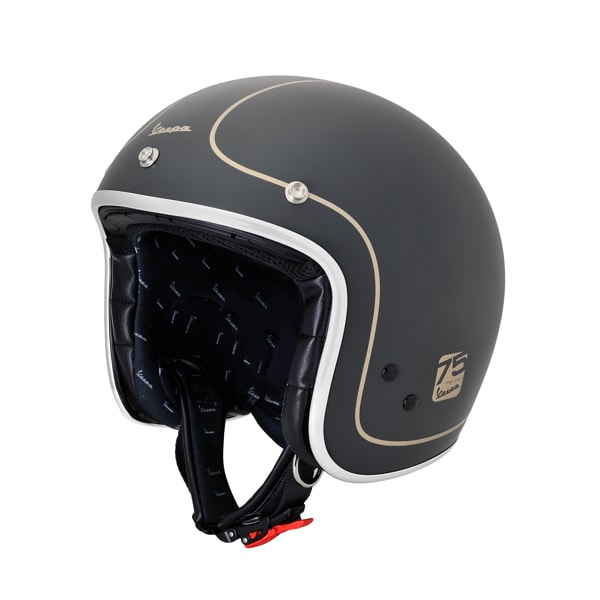 Immancabile il casco jet Vespa 75°, a tre bottoni con calotta in materiale termoplastico stampato ad iniezione, cinturino con chiusura micrometrica; look squisitamente celebrativo firmato Vespa 75th. Profili cromati, calotta verniciata in Grigio Smoke e grafica Giallo Zolfo con logo Vespa. Interni personalizzati Vespa, in tessuto anallergico, estraibili e lavabili. Gli accorgimenti tecnici e produttivi adottati sono all’insegna di precisione, qualità e massimo comfort garantiti dal Made in Italy, per muovere la passione Vespa in tutta sicurezza e libertà. Esclusiva sacca portacasco (compresa) in lino, personalizzata con il logo celebrativo, che conferisce a questo accessorio una marcia in più anche in fatto di stile, in aggiunta a sicurezza e massima funzionalità. Casco disponibile in 5 taglie, dalla XS alla XL. Omologazione ECE 22.05.