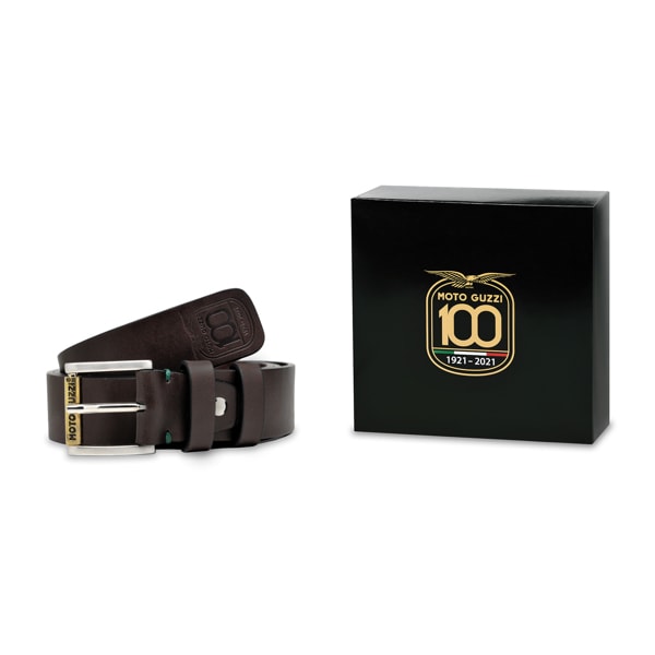 Moto Guzzi 100th belt: cintura in cuoio pieno spessore, colore testa di moro con fibbia in nichel spazzolato e rullo in ottone inciso con personalizzazione "Moto Guzzi". L'aggancio della fibbia sulla cintura è a vite e rifinita lateralmente con magliette di filo fatte a mano di color verde. Lungo tutta la sezione della cintura è stata applicata una laccatura di colore Nero. Personalizzazione con logo Moto Guzzi Centenario inciso a caldo all’estremità.