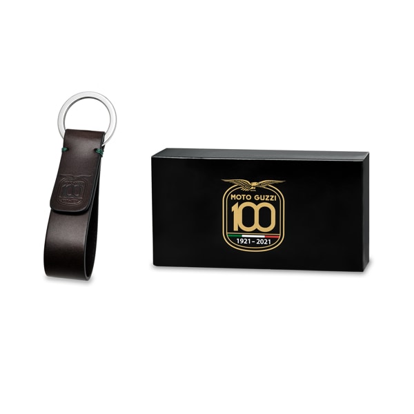 Moto Guzzi 100th keyring: portachiavi in cuoio pieno spessore, colore testa di moro con anello in nichel spazzolato, bloccato al portachiavi tramite due magliette di filo fatte a mano di color verde. Lungo tutta la sezione del portachiavi è stata applicata una laccatura di colore nero; logo Moto Guzzi Centenario impresso a caldo.