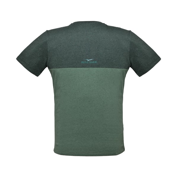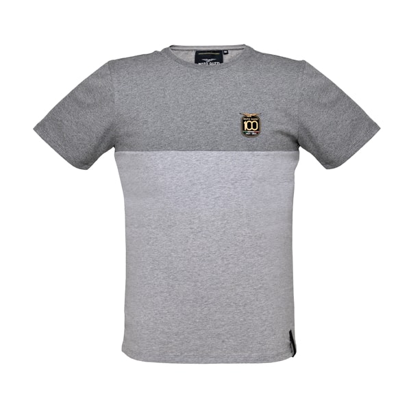 Moto Guzzi 100th t-shirts: bi-color t-shirt con taglio su torace (davanti e dietro), 100% cotone (160-170 grammi), con costina 95% cotone 5% elastan; scudetto termoadesivo Moto Guzzi Centenario, stampato a rilievo sul lato anteriore sinistro; etichetta con logo applicata davanti; transfer 3D del logo Moto Guzzi in colore al centro sul retro della t-shirt; etichetta simil pelle con logo applicata al fondo davanti.