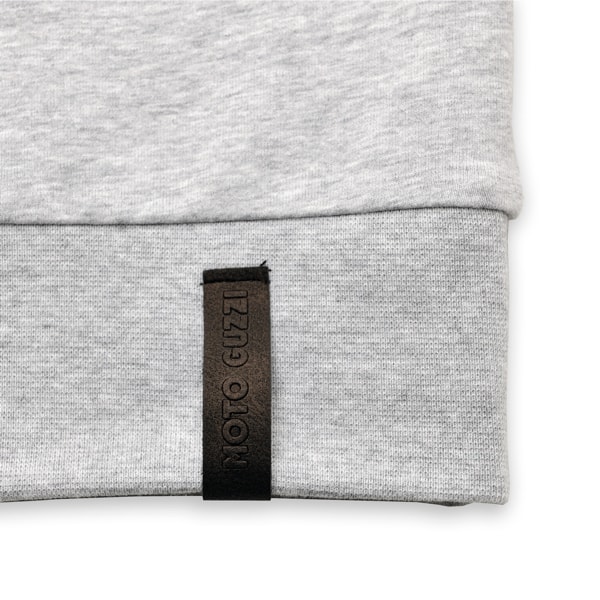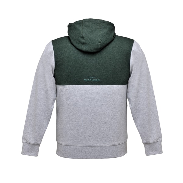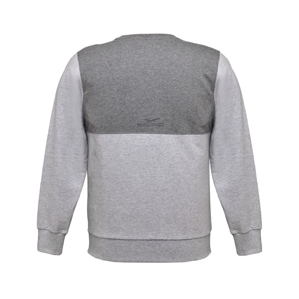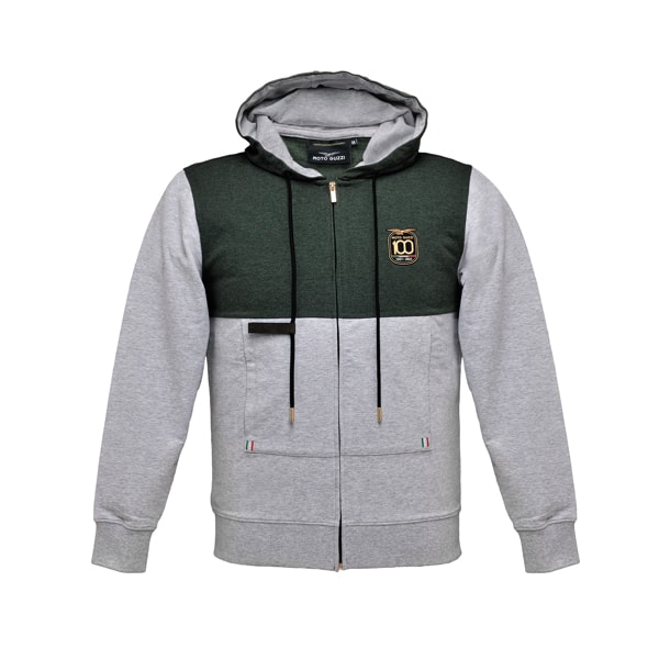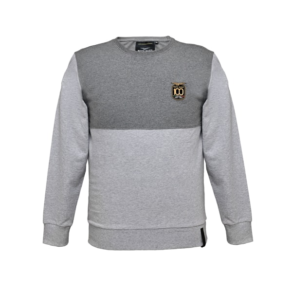 Moto Guzzi 100th sweatshirt: felpa bi-color grigio mélange; taglio sul torace (davanti e dietro). Materiale: felpa 275 grammi + costina, entrambe 95% cotone, 5% elastan; scudetto termoadesivo Moto Guzzi Centenario stampato a rilievo sul lato sinistro anteriore; transfer 3D del logo Moto Guzzi in colore, posizionato al centro sulla schiena; etichetta simil pelle con logo applicata al fondo davanti.