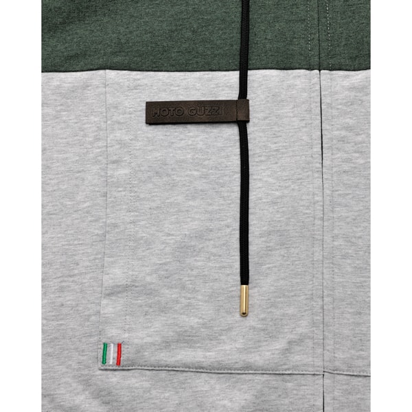 Moto Guzzi 100th hoodie: felpa con cappuccio bi-color verde, taglio su torace (davanti e dietro). Materiale: felpa 275 grammi + costina, entrambe 95% cotone 5% elastan; scudetto termoadesivo Moto Guzzi Centenario stampato a rilievo sul lato sinistro anteriore; transfer 3D del logo Moto Guzzi in colore, posizionato al centro sulla schiena; etichetta simil pelle marchiata MG applicata alla coulisse del cappuccio; coulisse cappuccio colore nero, con finalini in metallo oro opaco.