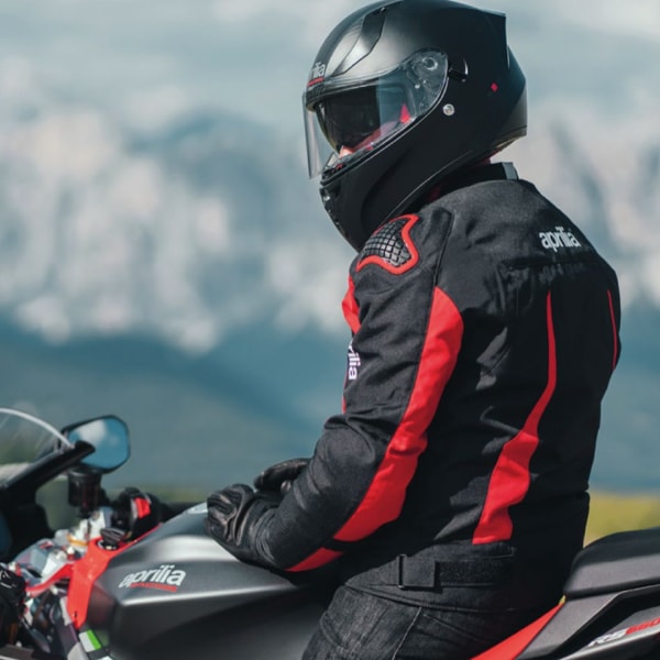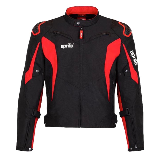 Aprilia Racing Jacket: Tessuto Tenax 250 g. resistente all'acqua. Poliammide resistente all'acqua 200g. Resistente all'abrasione. Ampie aree Flex Tenax su scapole, braccia e schiena per facilitare i movimenti. Certificato EN 17092. Protezione certificata EN1621-1 su spalle e gomiti. Slider esterno sulle spalle. Predisposto per paraschiena, certificato EN1621-2 Livello 1 o Livello 2 (venduto separatamente). Fodera interna in rete per una maggiore traspirazione. Fodera termica rimovibile da 100 g. Chiusure di regolazione laterali in VELCRO®. 2 tasche esterne, 1 tasca interna. Prese d'aria su spalle e schiena. Clip per pantaloni per il collegamento a pantaloni casual. Logo Aprilia sul petto e sulla schiena.