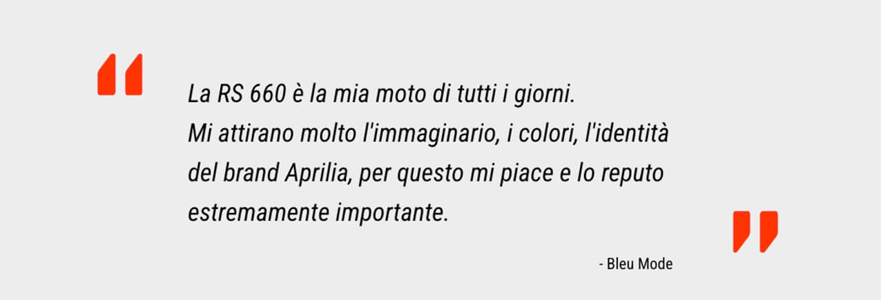 Oltre l'obiettivo: Julien Boudet, in arte "Bleu Mode”. Appassionato di auto e del mondo delle 2 ruote, Julien Boudet è l'artista francese che ha rivoluzionato il panorama visivo con la sua riflessione sull’iperconsumismo e la cultura del lusso. Le sue fotografie della collezione Aprilia Corporate sono un mix intenso di cultura visiva hip hop e sportiva, seppure inconfondibilmente mediterranea. Con il suo stile distintivo e l'uso di macchine fotografiche di medio formato, Boudet non si limita a fotografare, bensì racconta storie visive e reali, mescolando con ironia veicoli, loghi e monogrammi.