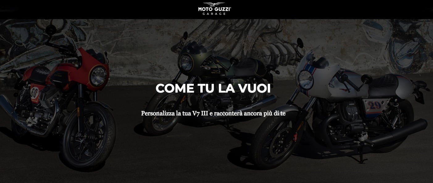 Progetto nato nel 2015, Moto Guzzi Garage ha interessato principalmente V7II per poi estendersi alla V7 di terza generazione, allargando questa inedita filosofia custom all’intero mondo delle motociclette Made in Mandello. Moto Guzzi focalizza sempre più la propria attenzione sul concetto di personalizzazione insito nel DNA di V7 estendendo l’offerta di Kit di accessori configurati come “proposte di stile” per orientare gli appassionati Guzzisti all’interno del variegato mondo custom.