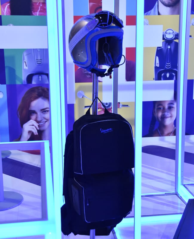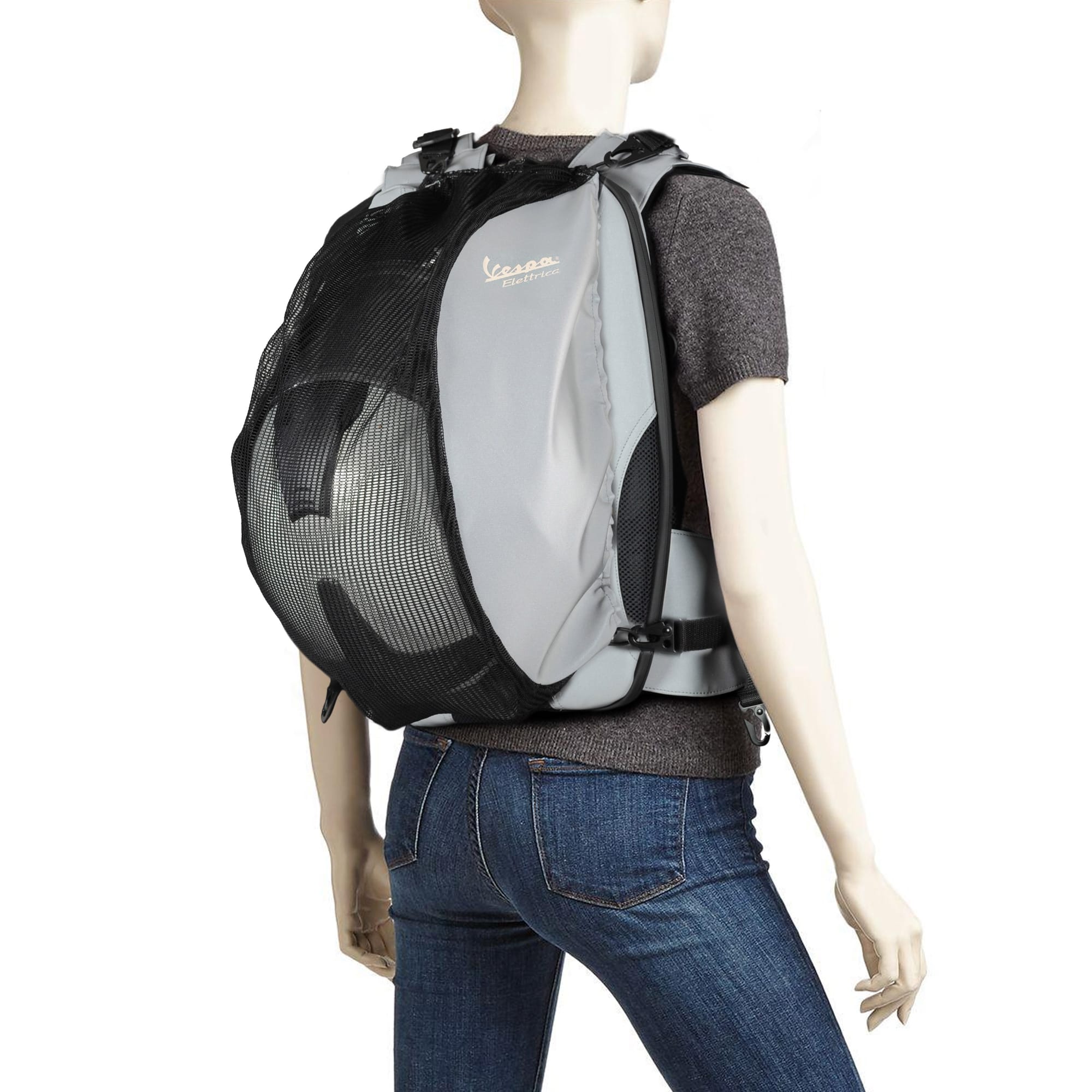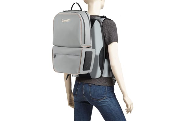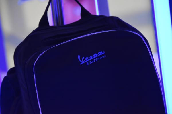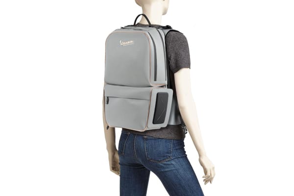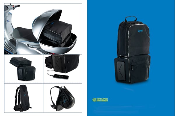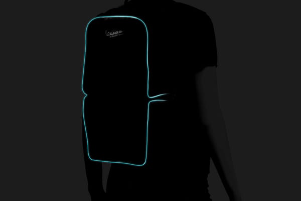 Un’altra novità è data dall’originale zaino con piping LED, scomponibile in borsa interna per il bauletto e paraschiena con sacca porta casco integrata. Dotato di un apposito scomparto per notebook e di una powerbank per la ricarica di dispositivi mobili, lo zaino è disponibile anche in un innovativo tessuto catarifrangente che richiama la tipica tinta grigio cromo di Vespa Elettrica.