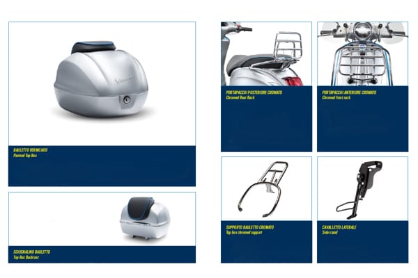 Il bauletto dedicato è completamente verniciato in tinta con il veicolo e arricchito dal celebre logo Vespa cromato in rilievo e può contenere un casco integrale. Il bauletto può essere completato con lo schienalino, rivestito con lo stesso materiale della sella. Il supporto cromato per il montaggio del bauletto è utilizzabile anche come portapacchi. Un tocco di eleganza in più è dato da sella e schienalino in vera pelle “made in Italy”, sottoposta a uno speciale trattamento protettivo che consente di mantenere un elevato livello di qualità nel tempo.