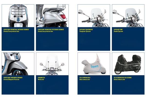 Ad arricchire Vespa Elettrica sono proposti anche il comodo cavalletto laterale –realizzato in acciaio verniciato in nero – che rende più agevole il parcheggio, il telo copriveicolo per esterno e quello indoor “big logo”, entrambi dotati di comode aperture per ospitare gli ingombri di eventuali accessori, e il tappetino in gomma antisdrucciolo.