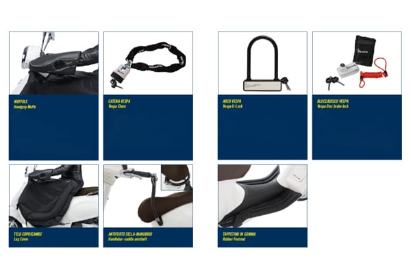 Per Vespa Elettrica sono disponibili l’antifurto elettronico e l’antifurto meccanico sella-manubrio, oltre a una linea di antifurti meccanici personalizzati. Immancabili le moffole e il telo copri gambe, pratico e veloce da montare, che offrono un’ottima protezione dagli agenti atmosferici grazie all’utilizzo di materiale termico. Il telo di Vespa Elettrica si contraddistingue per il logo Vespa in metallo e garantisce massima stabilità anche alle alte velocità. Il coprisella e l’antifurto sono integrati nell’accessorio.
