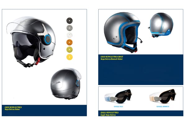 La linea accessori comprende anche lo speciale casco jet Tech dedicato a Vespa Elettrica, che coniuga stile e massima praticità integrando al proprio interno gli auricolari bluetooth per sfruttare al massimo le potenzialità del sistema VESPA MIA. Abbinabili al casco, gli occhiali goggle si distinguono per le lenti specchiate derivate dal mondo dello sci e per altre inedite finiture. È inoltre disponibile il casco demi-jet Vespa VJ Special Edition Vespa Elettrica, personalizzabile in linea con la tinta scelta per il veicolo.