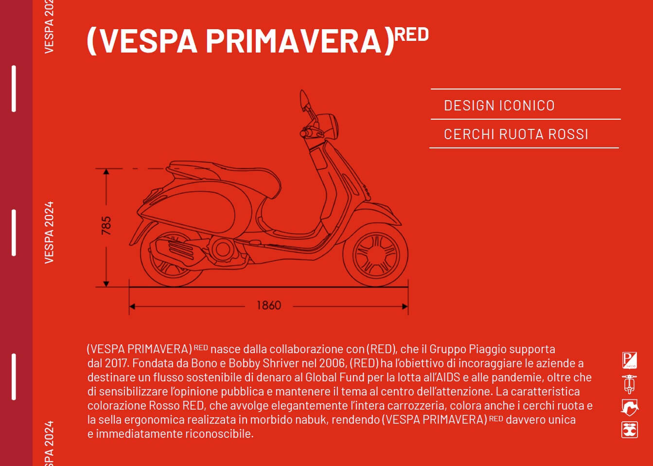 Infatti, per ogni prodotto (RED) venduto – dei partner top brands worldwide come Vespa – una quota va a sostenere l’organizzazione. I prodotti (RED) di Vespa sono disponibili nell’official Vespa Store online (https://store.vespa.com/it-it/c/vespa-RED-catalogue) e sul sito di (RED) (https://www.red.org/partner/vespa/); gli scooter della gamma Vespa (RED) – modello Primavera, versioni Elettrica 45 o 70 ; e 50, 125 e 150cc – nella rete dei dealers. (Vespa Elettrica) RED 70 e (Vespa Primavera) RED 150cc sono presenti anche sul sito di (RED).