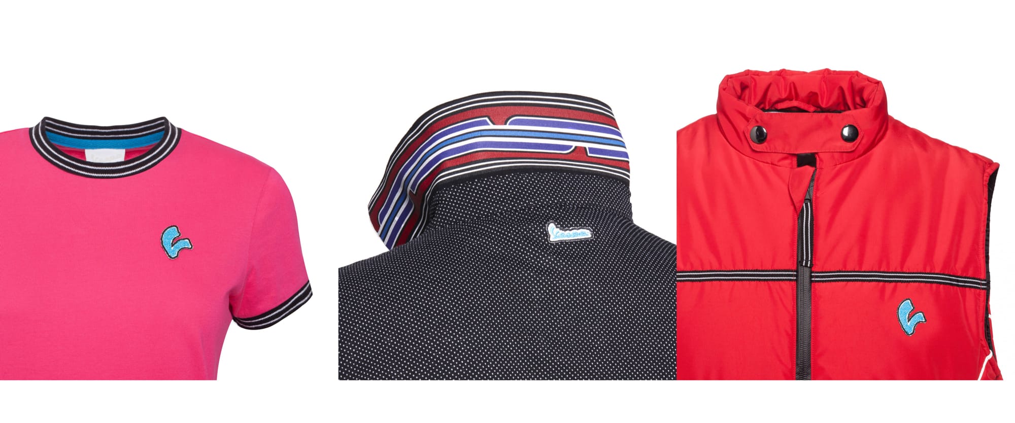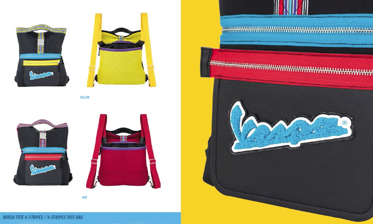 Tutti i capi, tra i quali le polo e le t-shirt in cotone mercerizzato, presentano i patch con ricamo tridimensionale che sono realizzati su basi catarifrangenti, evidenziando il legame tra funzionalità ed estetica che caratterizza la collezione Vespa Lifestyle. Gli accessori sono multi-funzionali, come il portachiavi da collo e key ring portatile, lo zaino convertibile in tote bag e la sacca studiata per contenere un casco.