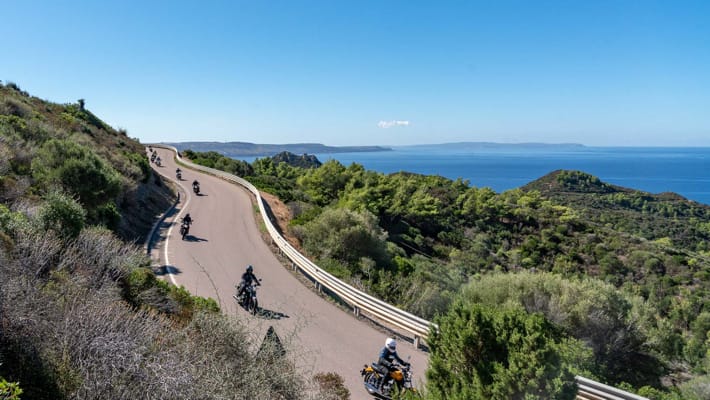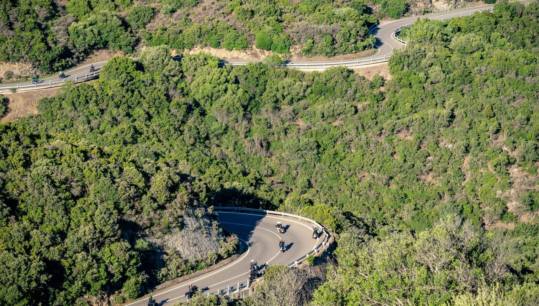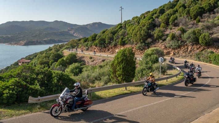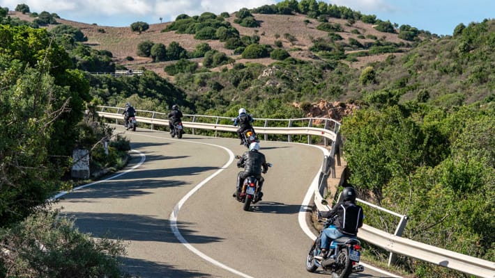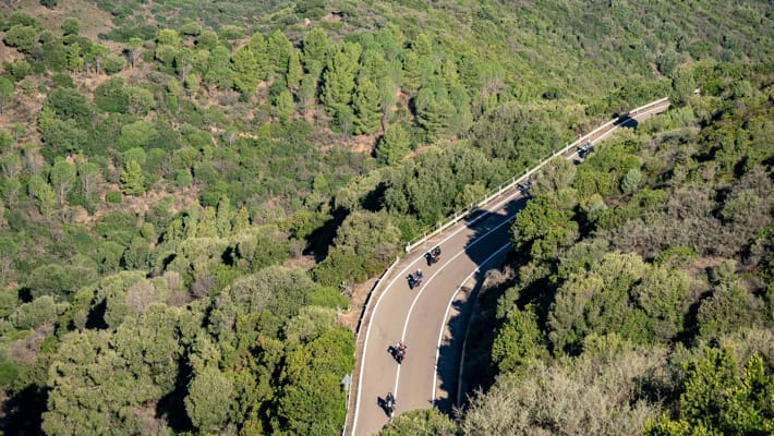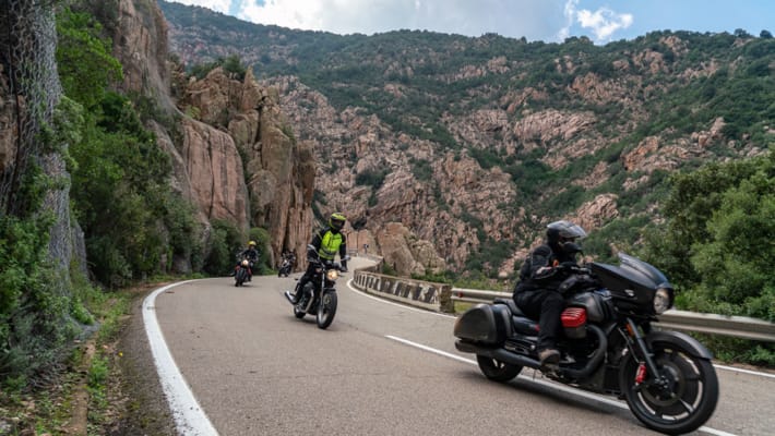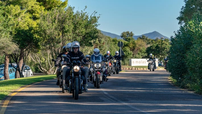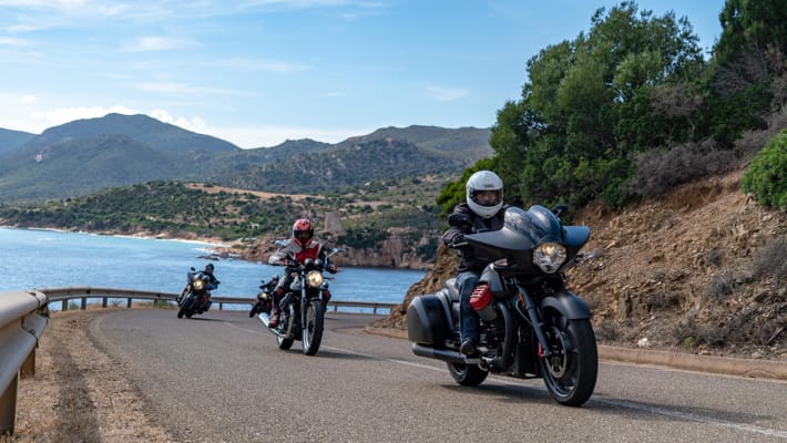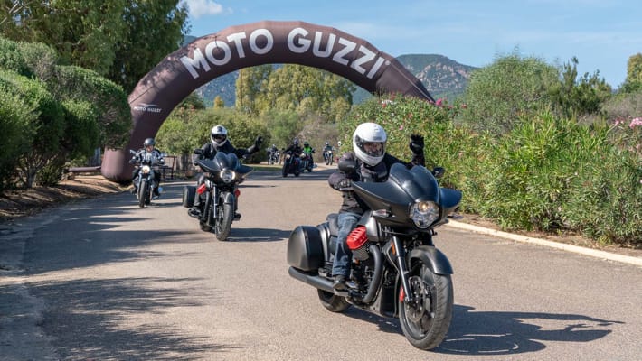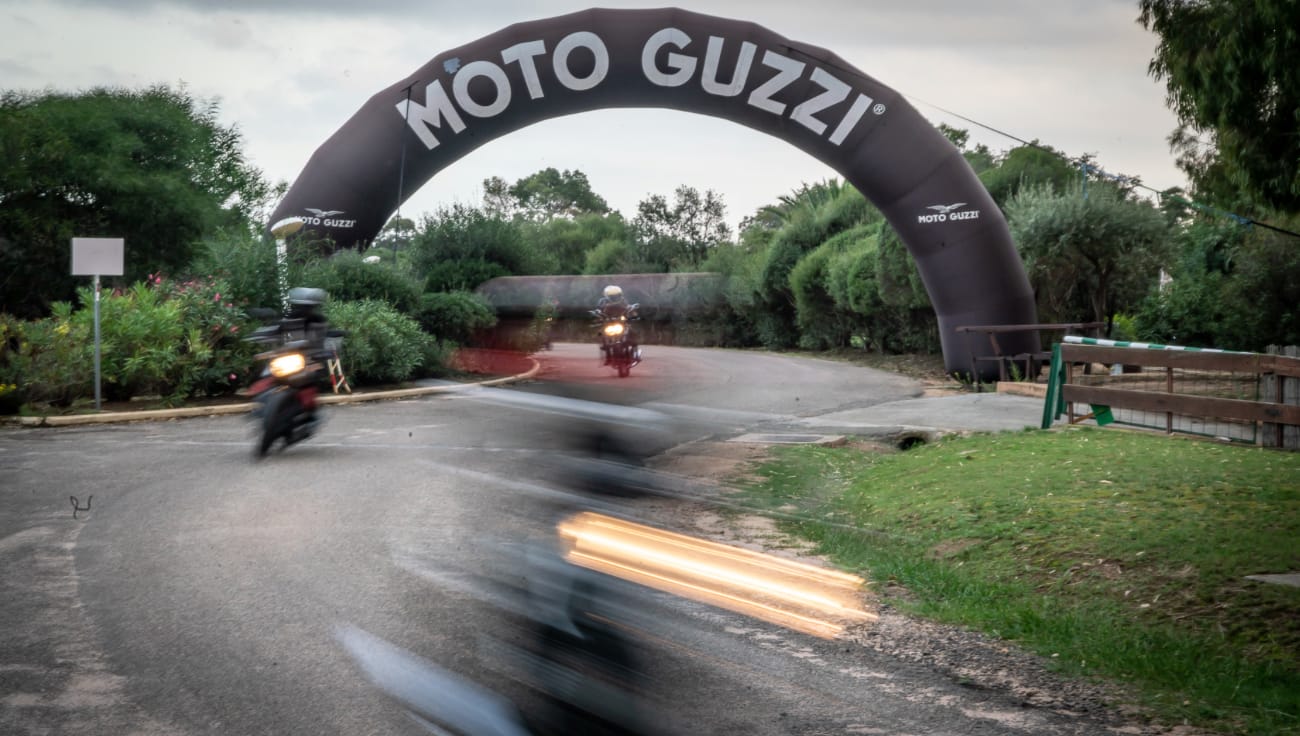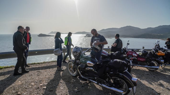 Casco, giacca… ma quale moto prendo? Ci sono tutte! Dai oggi V7 III Carbon, domani provo l’Audace, ma sabato la MGX-21 non mi scappa. Si passa in fila sotto l’arco “Moto Guzzi”, e molti ancora non lo sanno, ma quello non è solo un gonfiabile, è uno star gate per la più pura essenza del divertimento motociclistico in quel paradiso delle due ruote chiamato Sardegna. C’è un solo modo per familiarizzare davvero con una Moto Guzzi, ed è farlo nel suo elemento naturale: le curve! Qui certo non si fanno attendere: la strada si arrampica sulla montagna, il pulsare del bicilindrico si sintonizza sul ritmo delle curve, e bastano pochi km per trovare la perfetta sintonia. La lunga fila di moto si compatta e poi si dilata, snodandosi su entrambi i lati della vallata e inondando di cromature il verde intenso della strada che ci conduce a Teulada. Il bosco si apre e lascia spazio al blu accecante del mare, mentre la strada si aggrappa alla scogliera per condurci verso la magnifica spiaggia di Chia, dove la pausa caffè dà il tempo di tornare con i piedi per terra e di scambiarci le prime impressioni sulle moto e sull’esperienza che stiamo vivendo. La conversazione prosegue davanti alla sostanziosa cena offerta dal Resort, e poi al bar della piscina. La temperatura estiva e qualche giro di mirto bastano per creare un’atmosfera molto piacevole, che ben presto lascia affiorare le storie di vita e di viaggio di ognuno dei partecipanti. Si respira un perfetto spirito di gruppo, mentre la fantasia vaga già sulle strade che percorreremo nei prossimi giorni…