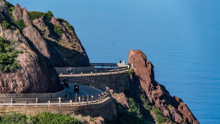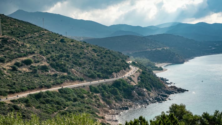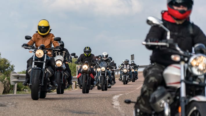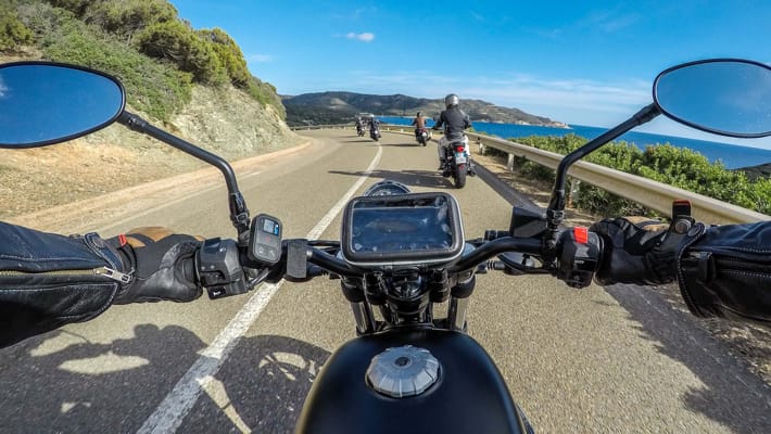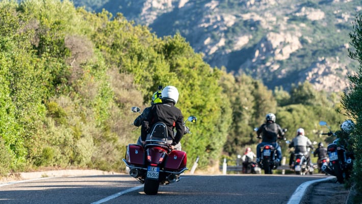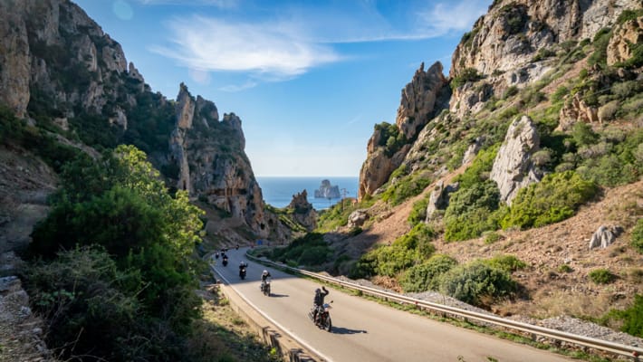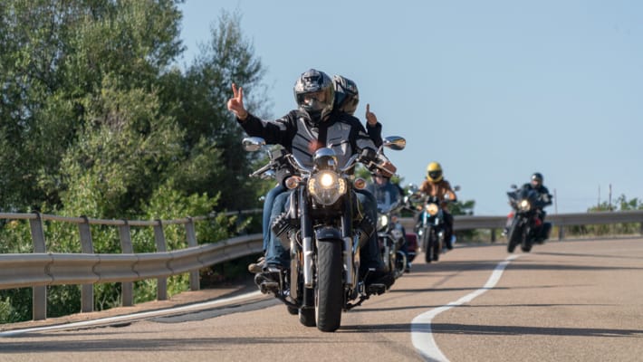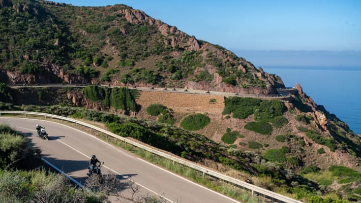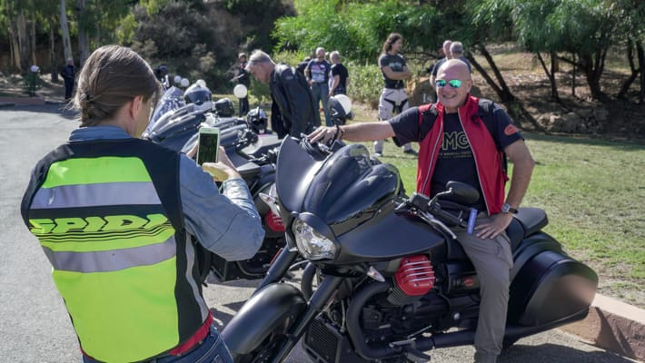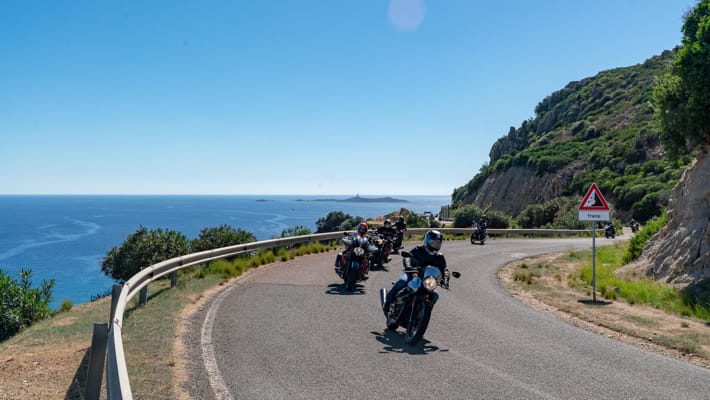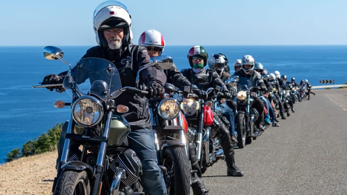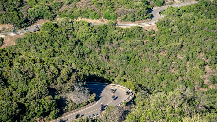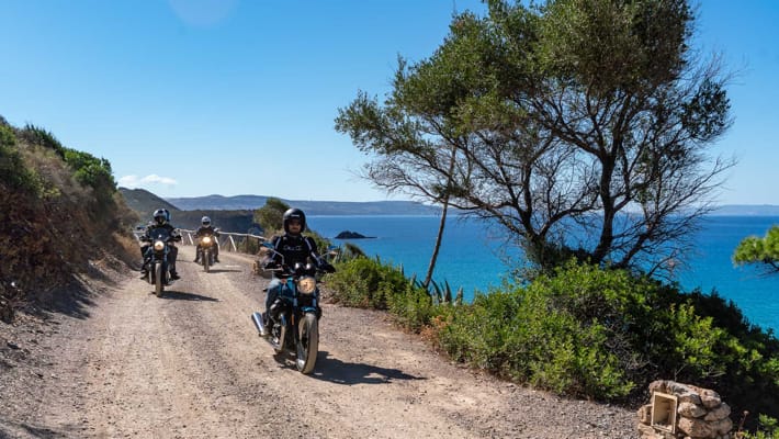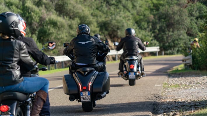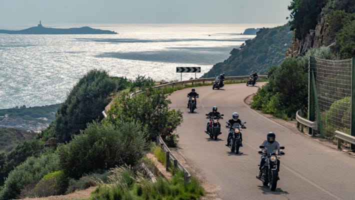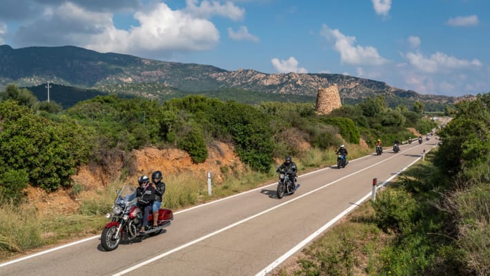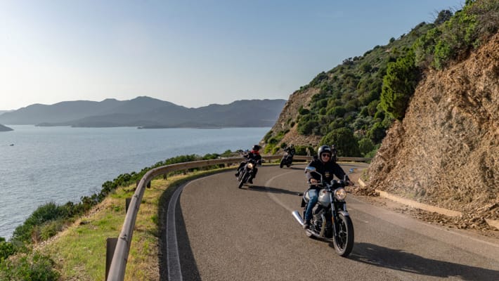Casco, giacca… ma quale moto prendo? Ci sono tutte! Dai oggi V7 III Carbon, domani provo l’Audace, ma sabato la MGX-21 non mi scappa. Si passa in fila sotto l’arco “Moto Guzzi”, e molti ancora non lo sanno, ma quello non è solo un gonfiabile, è uno star gate per la più pura essenza del divertimento motociclistico in quel paradiso delle due ruote chiamato Sardegna. C’è un solo modo per familiarizzare davvero con una Moto Guzzi, ed è farlo nel suo elemento naturale: le curve! Qui certo non si fanno attendere: la strada si arrampica sulla montagna, il pulsare del bicilindrico si sintonizza sul ritmo delle curve, e bastano pochi km per trovare la perfetta sintonia. La lunga fila di moto si compatta e poi si dilata, snodandosi su entrambi i lati della vallata e inondando di cromature il verde intenso della strada che ci conduce a Teulada. Il bosco si apre e lascia spazio al blu accecante del mare, mentre la strada si aggrappa alla scogliera per condurci verso la magnifica spiaggia di Chia, dove la pausa caffè dà il tempo di tornare con i piedi per terra e di scambiarci le prime impressioni sulle moto e sull’esperienza che stiamo vivendo. La conversazione prosegue davanti alla sostanziosa cena offerta dal Resort, e poi al bar della piscina. La temperatura estiva e qualche giro di mirto bastano per creare un’atmosfera molto piacevole, che ben presto lascia affiorare le storie di vita e di viaggio di ognuno dei partecipanti. Si respira un perfetto spirito di gruppo, mentre la fantasia vaga già sulle strade che percorreremo nei prossimi giorni…