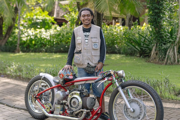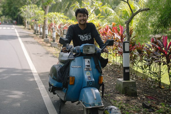 “Vespa è stato il primo scooter di mio padre: ama sempre la forma e la sensazione di guidarla. Adoro il modo in cui mi ha detto come la ama e la usa giorno per giorno. La sua prima Vespa è stata la Vespa PX 150, poi l'ha venduta per cambiarla con una Vespa Super 150 (VBC) PT del 1977. Dan Motor versione Indonesia. Ma ha sempre sognato di avere Vespa Sprint 150 (VLB) perché, nella sua città natale a Solo, Vespa Sprint è la più popolare. Non mi è stato permesso di guidare fino al 2003, mio padre mi ha insegnato a guidare e Vespa è stata il veicolo su cui ho imparato a guidare: era la sua Vespa Super 150 del 1977. Da allora mi sono innamorato di Vespa. L'ho guidata ovunque, e anche io l'ho usata per guidare fino alla città natale di mio padre a Solo (Surakarta, l’antica capitale di Giava, ndr) da Jakarta (550 Km). Ho conosciuto un altro pilota Vespa, sono entrato nel mio primo Vespa club, e quindi sono venuto a Bali nel 2004 (a 16 anni) da Jakarta guidando la Vespa Super 150 VBC per la prima volta in assoluto. Praticamente sono cresciuto con Vespa”.