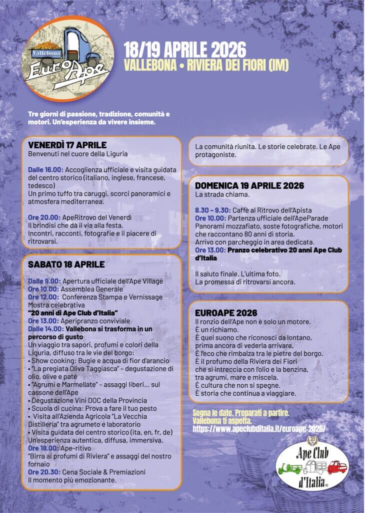 Aprile 2026 (G.T.) – Svelato il programma del raduno EuroApe 2026 che celebrerà insieme gli 80 anni dell’Ape (*) e i 20 anni dell’Ape Club d’Italia, come annunciano gli organizzatori dell’Ape Club Italia. Sabato 18 e domenica19 aprile 2026 Vallebona (Imperia), nel cuore della Riviera dei Fiori in Liguria, diventerà il punto di incontro degli Apisti provenienti da tutta Italia e dall’Europa. Due giorni per ritrovarsi, condividere la passione e vivere l’Ape nel modo più autentico: tra strada, territorio e comunità.