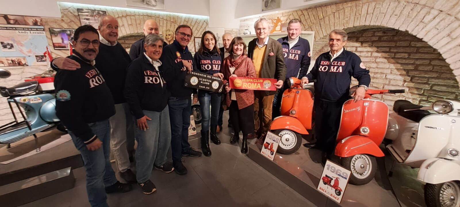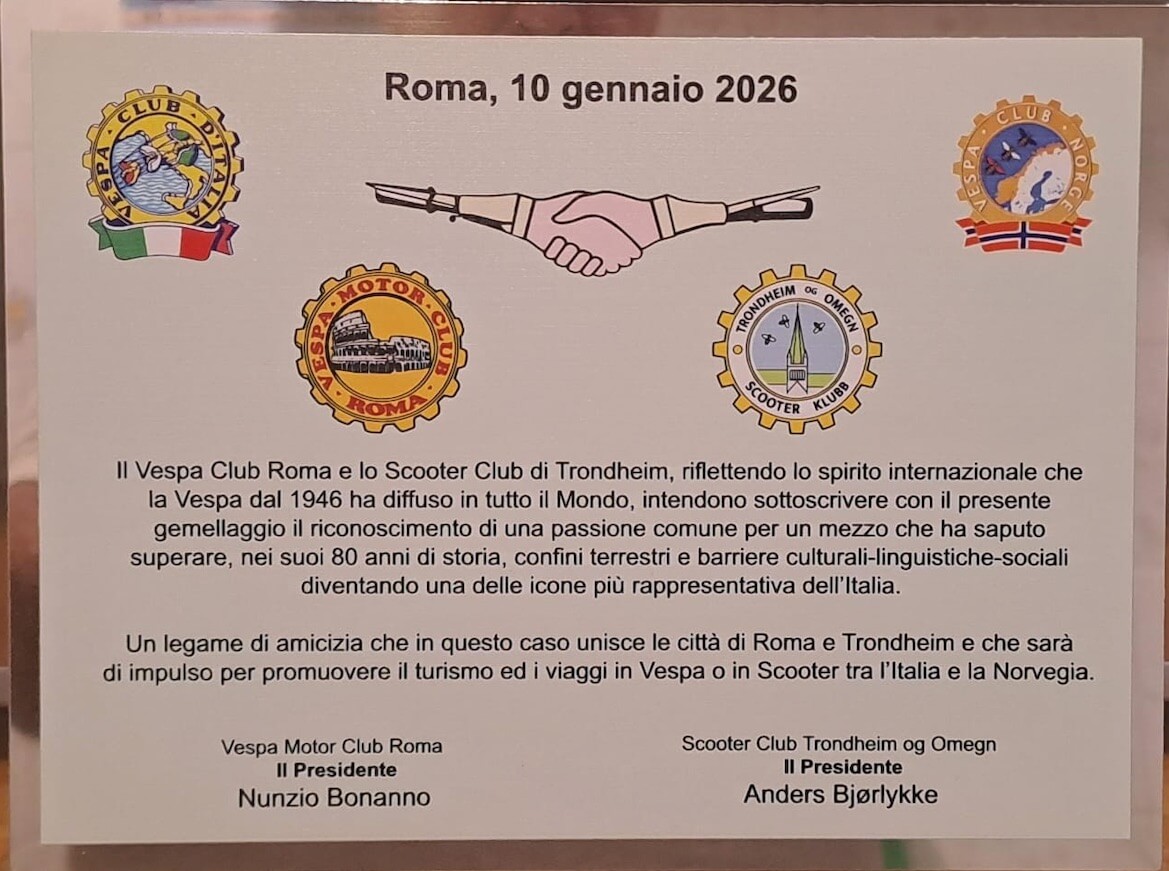 Gennaio 2026 (G.T., articolo in collaborazione con Paola Scarsi, giornalista e scrittrice) –Sabato 10 gennaio 2026 si è svolto a Roma (nella cornice del Museo Spazio Vespa del Rent Scooter Bici&Baci di via Cavour, a pochi passi dal Colosseo, nel cuore della Capitale), il gemellaggio fra il Vespa Motor Club Roma (fondato nel 1948, fa parte del Vespa Club d’Italia) e il Trondheim og Omegn Scooter Klubb di Trondheim (attivo dal 1988, fa parte del Vespa Club Norvegia).
