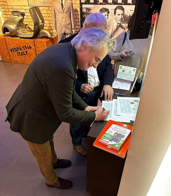 E, soprattutto, un incontro importante qui a Roma, nel 2019, quando ho incontrato Calogero per la prima volta. Nel 2023 il club ha festeggiato il suo venticinquesimo anniversario. E quattro dei nostri membri sono stati presentati nel libro di Paola, La Vespa non si scorda mai. Oggi, nel 2026, il club conta quarantacinque appassionati, con una bellissima collezione di Lambretta e Vespa d’epoca, e anche alcune Vespa moderne. Il Vespa Motor Club Roma porta avanti l’eredità della terra natale della Vespa. Un’eredità profondamente legata alla storia, alla cultura e alla passione. Diventare oggi club amici significa molto più che scrivere un nome su un foglio di carta. Uniamo nord e sud, passato e presente e, soprattutto, le persone. Questa amicizia significa nuovi incontri, viaggi insieme e belle storie da raccontare. Sia in sella alla Vespa, sia dopo seduti a tavola. Che questo segni l’inizio di tante esperienze e ricordi condivisi. Da Roma a Trondheim, e da Trondheim a Roma. A nome del Trondheim og Omegn Scooter Klubb, sono orgoglioso di dichiarare la nostra amicizia con il Vespa Motor Club Roma. Buona strada e buon viaggio, amici!”.
