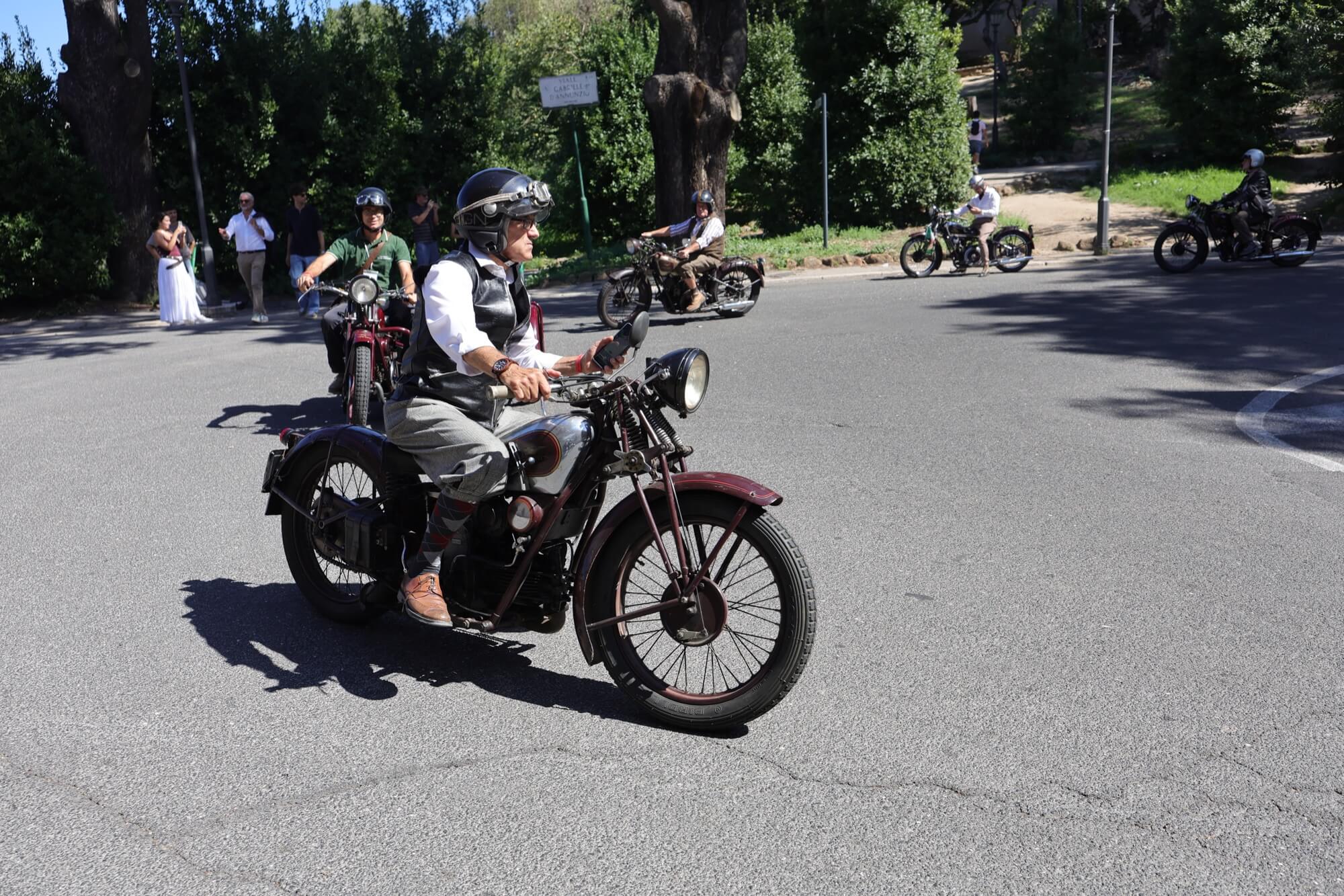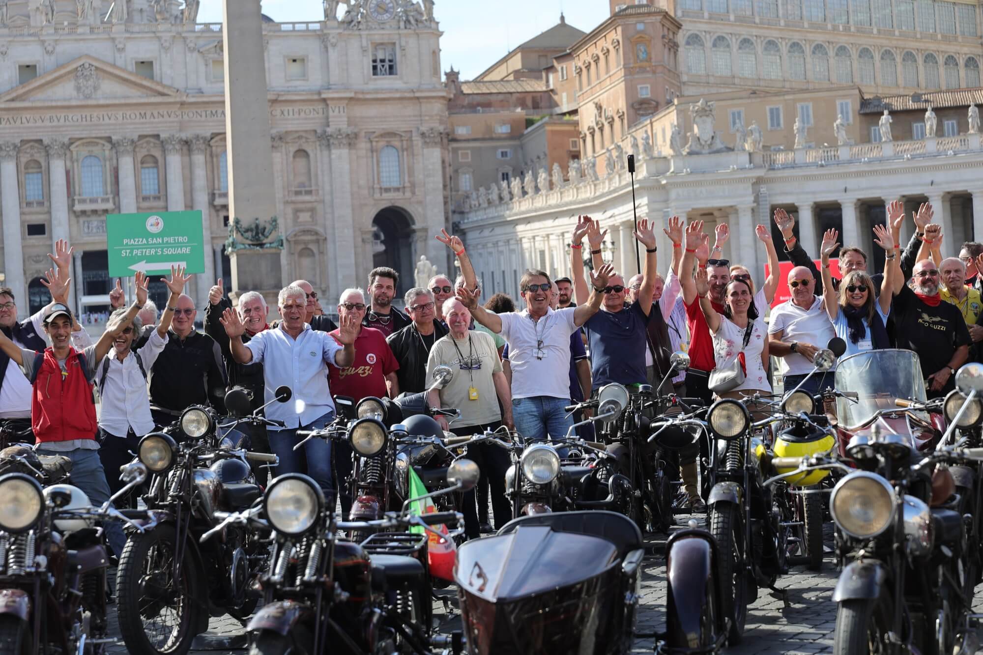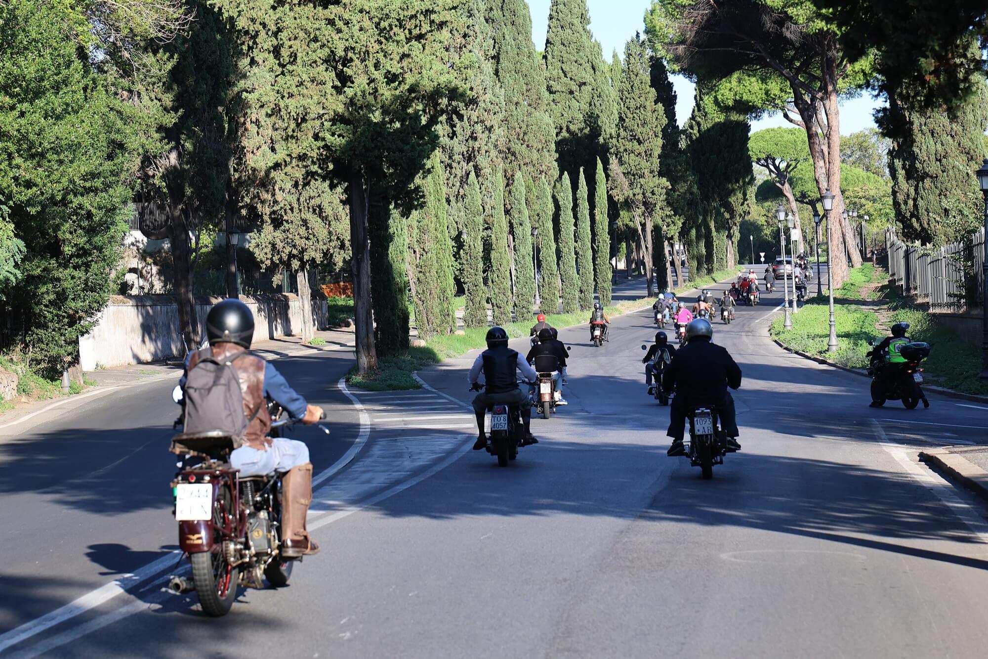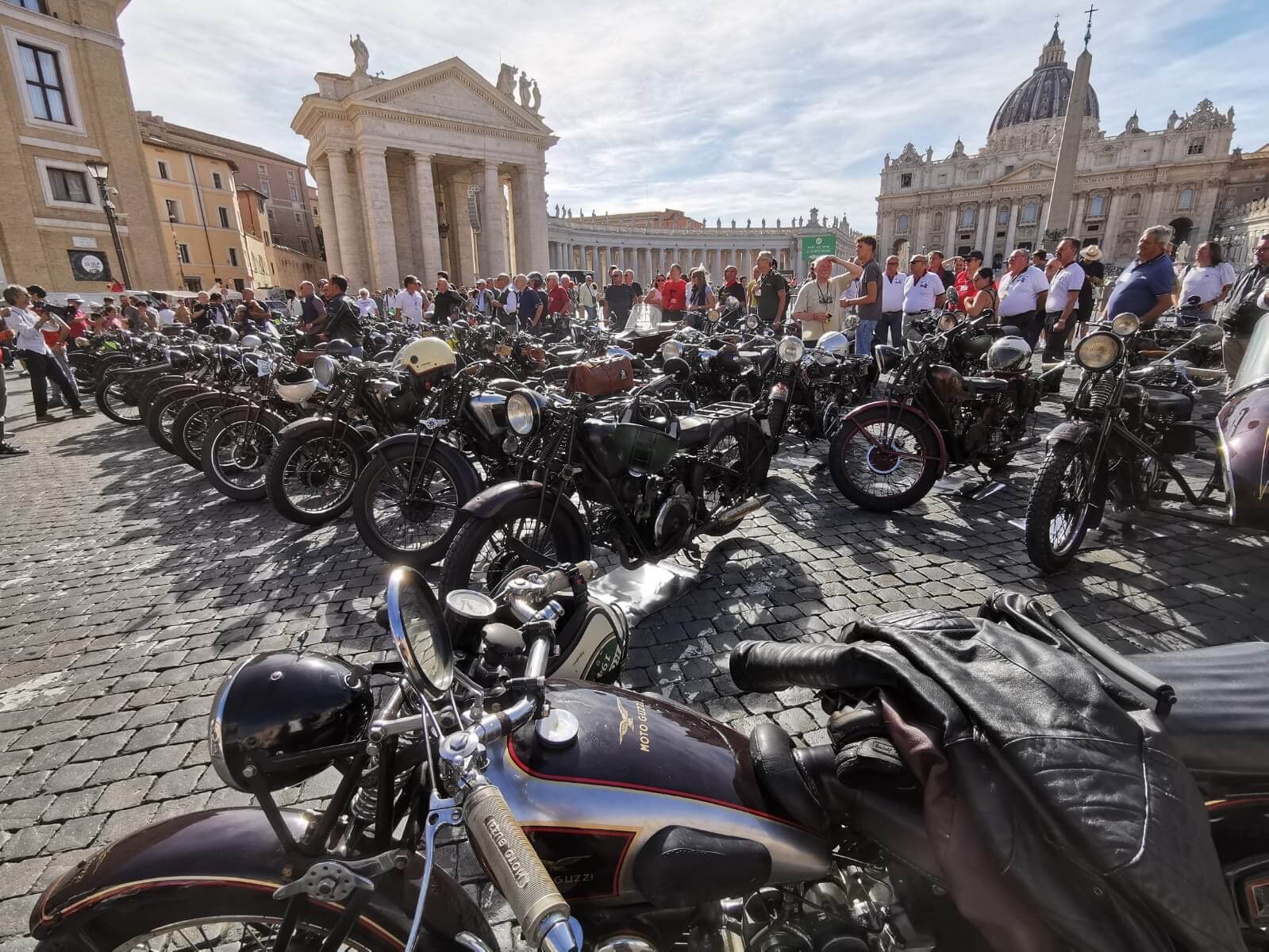 Grandioso il programma messo a punto dai tecnici della scuderia romana «La tartaruga»: non solo una full immersion nella latinità e nelle antichità classiche romane, ma anche l'emozione di un percorso guidato dalla polizia locale di «Roma Capitale» in motocicletta che hanno permesso agli oltre 100 partecipanti di godere delle bellezze classiche, architettoniche e storiche della Capitale. Nell'anno del Giubileo non era nemmeno ipotizzabile l'idea di potersi affacciare su piazza San Pietro con le moto. Ma i contatti avviati da mesi da parte dell'organizzazione hanno permesso non solo una visita nella Basilica di Sant'Agostino, nel cuore del Vaticano, ma addirittura l’Autorità Pontificia ha permesso il transito e una lunga sosta del corteo di due ruote storiche in via della Conciliazione, con esposizione delle oltre 100 moto ai margini di Piazza San Pietro. Il cuore della cristianità, tra centinaia di migliaia di fedeli che hanno partecipato sabato all'udienza di Papa Leone XIV, si è riempito dei mitici rombi dei monocilindrici di Mandello del Lario.
