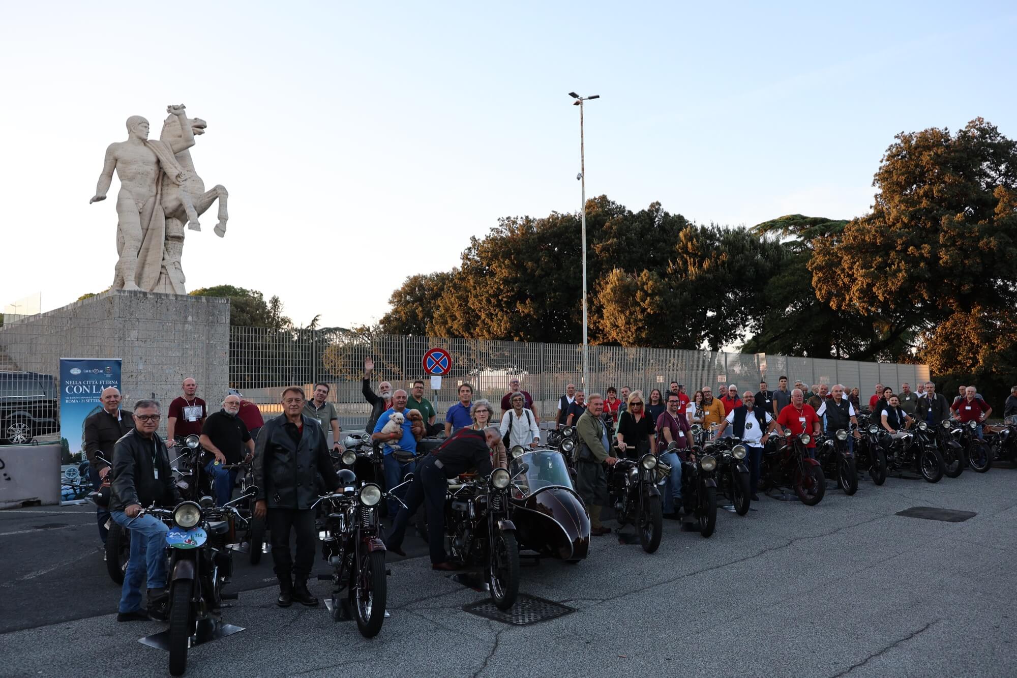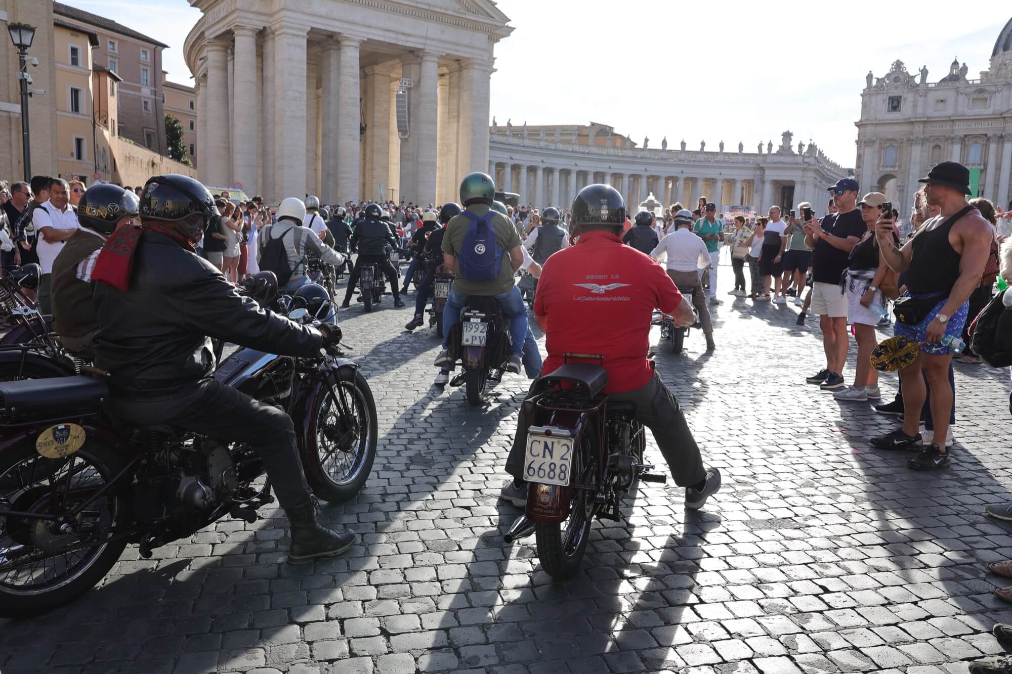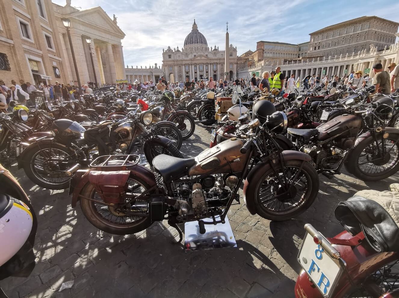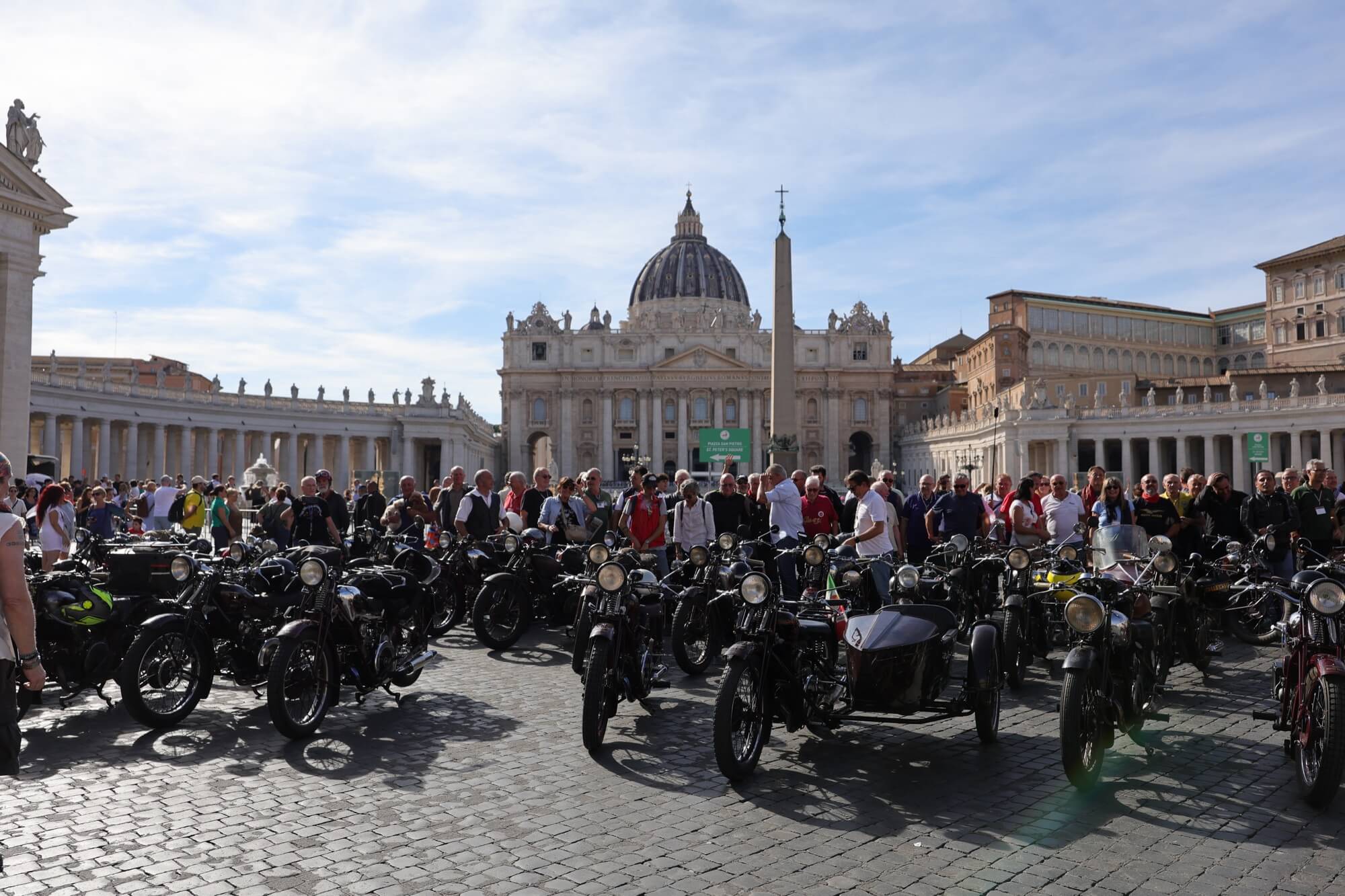 Grandioso il programma messo a punto dai tecnici della scuderia romana «La tartaruga»: non solo una full immersion nella latinità e nelle antichità classiche romane, ma anche l'emozione di un percorso guidato dalla polizia locale di «Roma Capitale» in motocicletta che hanno permesso agli oltre 100 partecipanti di godere delle bellezze classiche, architettoniche e storiche della Capitale. Nell'anno del Giubileo non era nemmeno ipotizzabile l'idea di potersi affacciare su piazza San Pietro con le moto. Ma i contatti avviati da mesi da parte dell'organizzazione hanno permesso non solo una visita nella Basilica di Sant'Agostino, nel cuore del Vaticano, ma addirittura l’Autorità Pontificia ha permesso il transito e una lunga sosta del corteo di due ruote storiche in via della Conciliazione, con esposizione delle oltre 100 moto ai margini di Piazza San Pietro. Il cuore della cristianità, tra centinaia di migliaia di fedeli che hanno partecipato sabato all'udienza di Papa Leone XIV, si è riempito dei mitici rombi dei monocilindrici di Mandello del Lario.