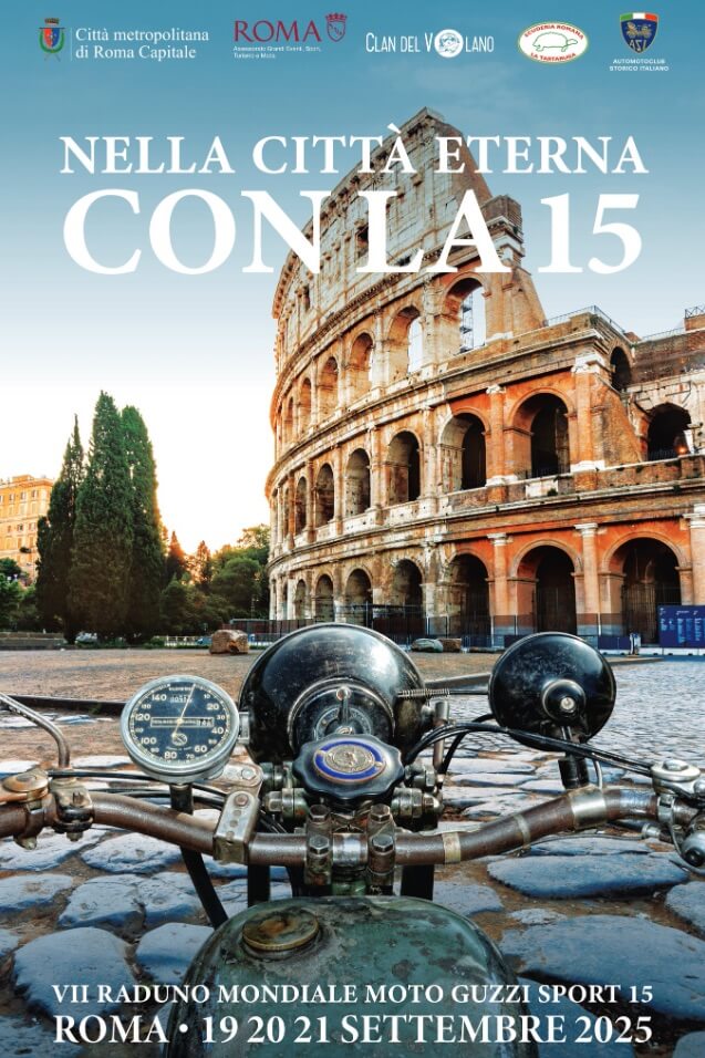 Roma diventa capitale del motorismo storico. Dal 19 al 21 settembre si svolgerà nella città eterna il VII Raduno Mondiale Moto Guzzi Sport 15 – “Nella Città Eterna con la 15” – promosso dal Clan del Volano; un evento che porterà in strada oltre 100 motociclette d’epoca degli anni ’30, con una serie di appuntamenti che toccheranno i luoghi più iconici della Capitale e del litorale romano.