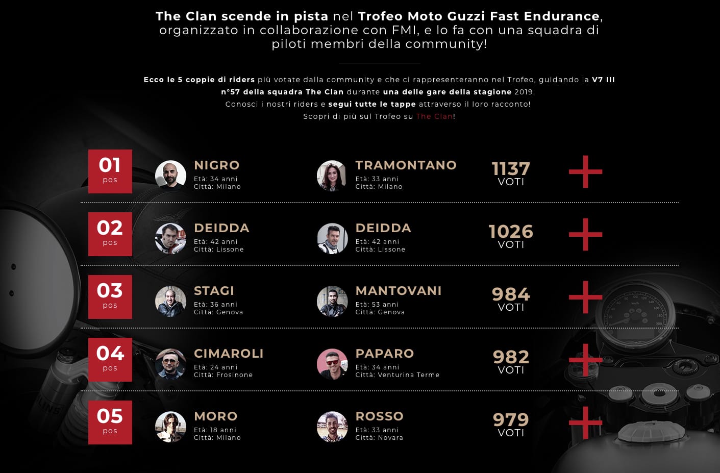 14 Marzo 2019 – Ecco i volti di 10 membri della community, 5 coppie di rider che, grazie a migliaia di voti online di appassionati, stanno per realizzare il loro sogno Guzzista: rappresentare The Clan nel Trofeo Moto Guzzi Fast Endurance, guidando la V7 III n° 57 della squadra ufficiale della community dell’Aquila di Mandello!