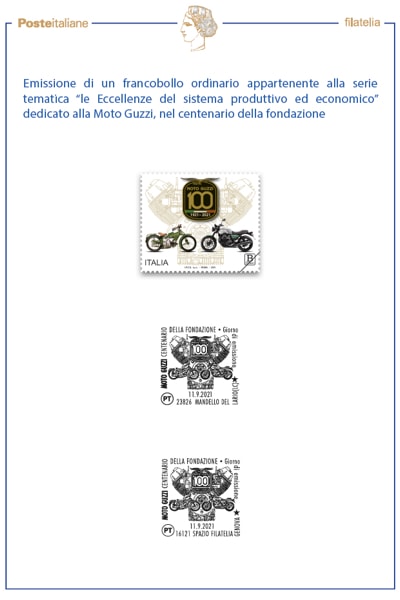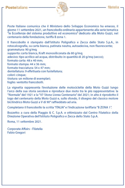 Bollettino Moto Guzzi, fonte: https://filatelia.poste.it/files/1476544964883/45%29-11-09-2021-B.I.-Moto-Guzzi.pdf