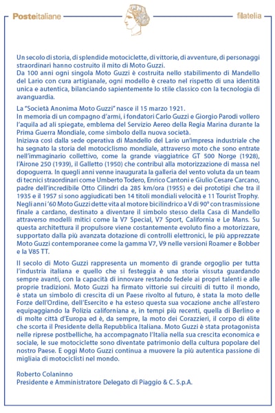 Serie tematica “le Eccellenze del sistema produttivo ed economico” dedicata alla Moto Guzzi, nel centenario della fondazione. Bollettino illustrativo con articolo a firma di Roberto Colaninno, Presidente e Amministratore Delegato di Piaggio & C. S.p.A. Il bollettino è posto all'interno di una cartella personalizzata con patella. Formato cartella. Dimensioni: cm. 25 x 17,5 (chiuso. Carta: Acquerello Avorio da gr/mq 240. Stampa: in quadricromia con elementi in lamina d’oro e serigrafia. Note: La cartella riporta il prezzo del prodotto, il codice a barre per la vendita e il bollino anticontraffazione con la numerazione/indicazione della tiratura posta.