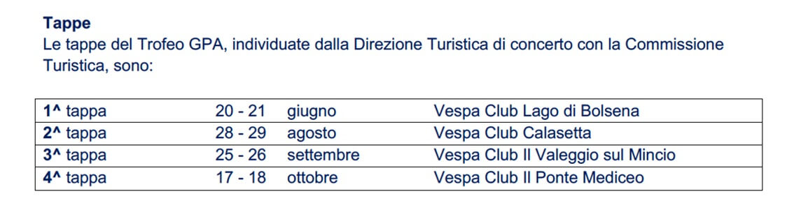 “Per rendere ancor più interessante il Trofeo GPA, le 4 tappe sono state scelte prendendo in considerazione le proposte pervenute dai Vespa Clubs di località importanti per interesse turistico e storico-culturale”.