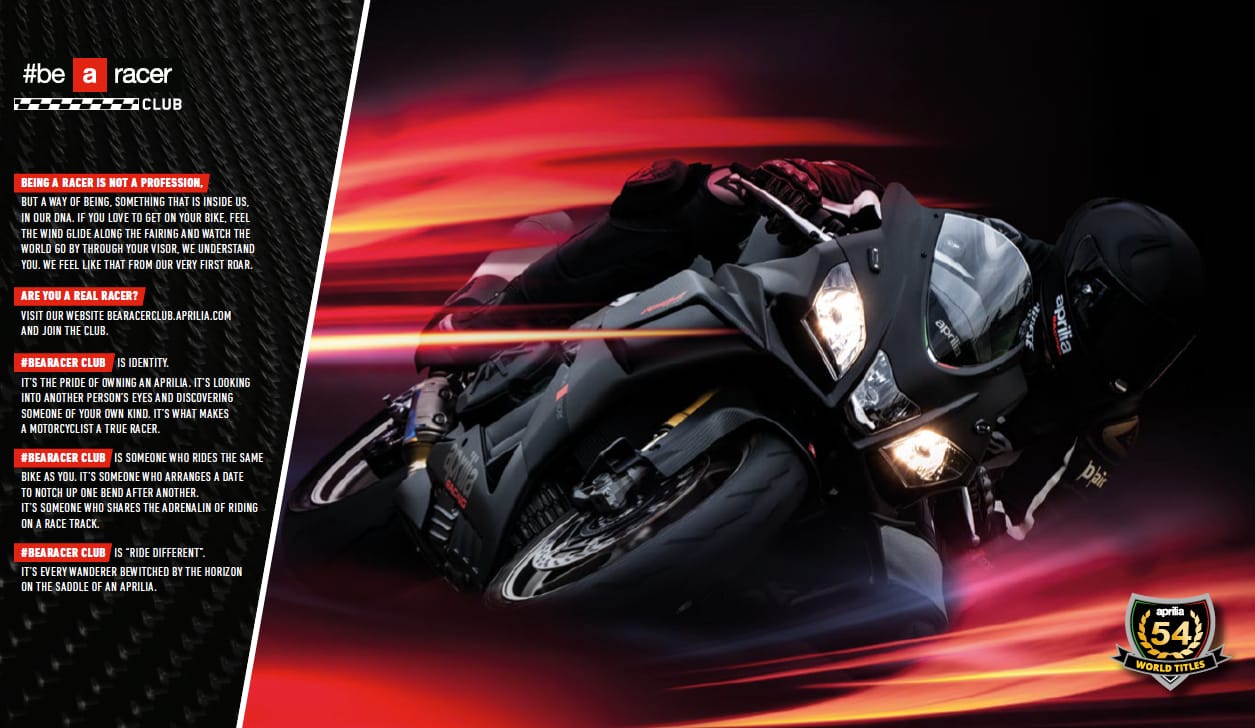“Aprilia Racers Days: bastano queste 3 parole per farci tendere i muscoli e pompare l’adrenalina nelle vene! Se però pensavamo di conoscerne già il significato, prepariamoci a farci sorprendere dalla stagione 2019 delle giornate in pista con le V4 Aprilia! Pure emozioni, nessun limite! Ecco il segreto delle due formule rinnovate Aprilia Racers Days, pensate apposta per chi non si accontenta dei semplici test ride ma vuole provare vere e proprie esperienze da racers in sella alle moto di Noale!