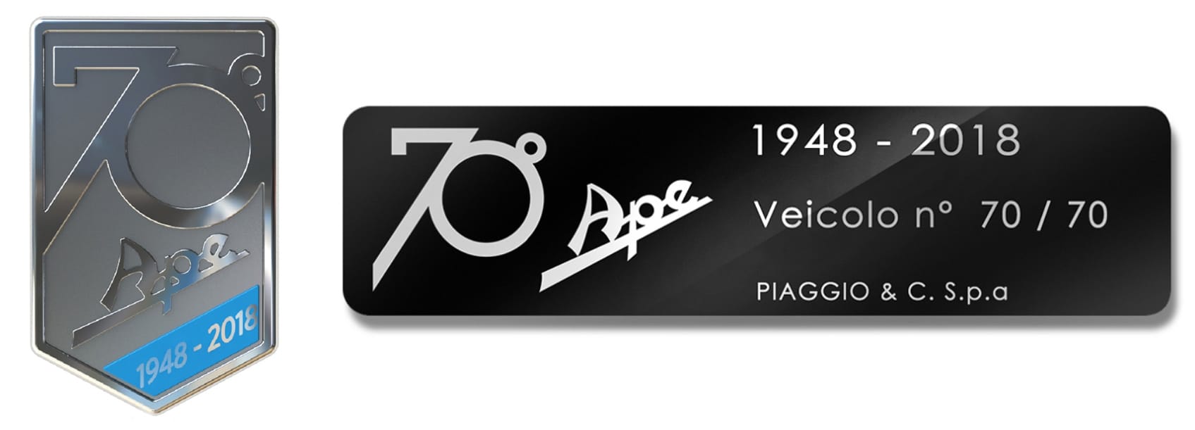 Proprio per festeggiare il suo fascino intramontabile, rendiamo omaggio alla versione più amata della gamma Ape con un’esclusiva versione che celebra il 70esimo anniversario della nascita del mito. Infatti, saranno prodotti solo 70 esemplari numerati che arriveranno nei punti vendita a partire da Settembre 2018. Questa Edizione Speciale si caratterizza per alcuni raffinati e significativi dettagli quali: colore speciale Neptune Blue; bordino di rifinitura in tinta carrozzeria per il rivestimento sedili e per la cover della ruota di scorta; targa Celebrativa 70° affissa sia sulla parte anteriore che posteriore del veicolo; targa di numerazione progressiva degli esemplari. A corredo dell’Edizione Speciale, ai clienti sarà consegnato un elegante portadocumenti di pelle con Targa Celebrativa e un esclusivo portachiavi della stessa linea.