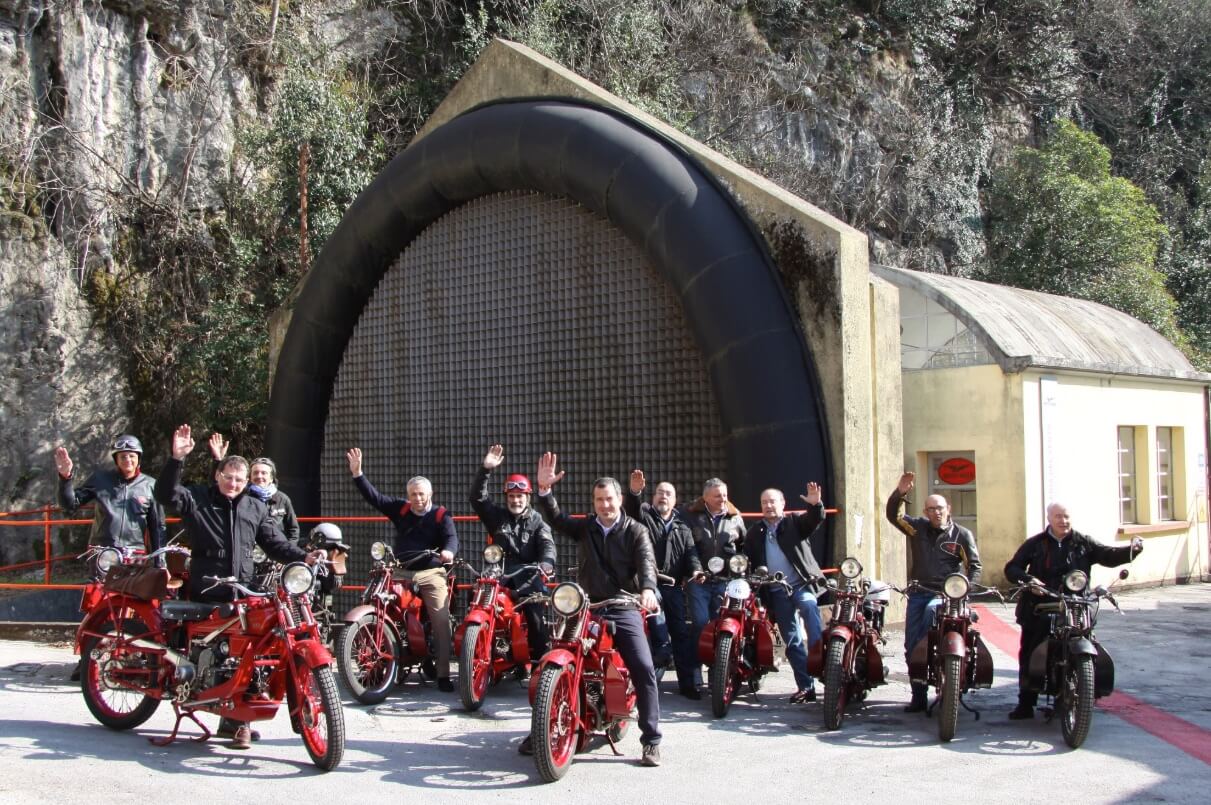 Dall’album dei ricordi (marzo 2012): in sella alle amate Moto Guzzi davanti alla Galleria del Vento, nello stabilimento del marchio dell’aquila, Mandello del Lario.