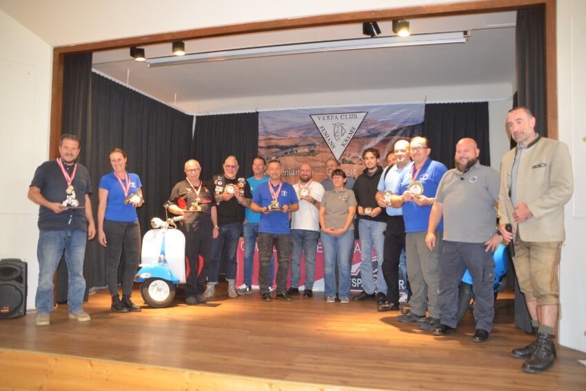 Dopo un pranzo conviviale, il pubblico ha potuto assistere alle premiazioni, momento clou dell’evento. Vincitore assoluto: Gerhard Ott (club RV Hollabrunn, Austria); secondo posto: Markus Gradner (club IG Stanglvespa, Austria); Terzo: il campione in carica Hans-Werner Both (Vespa Club Düsseldorf e.V., Germania). E riconoscimenti per categorie: 8 pollici; 10 pollici; automatiche; Ladies (1° l’austriaca Claudia Ott, RV Hollabrunn).