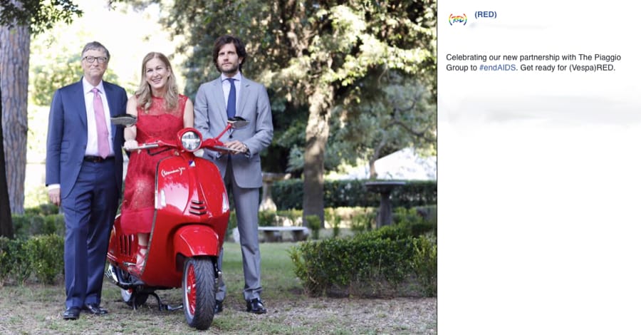 Roma, 27 giugno 2016 – Il Gruppo Piaggio e (RED) hanno annunciato l’avvio di una partnership a sostegno della raccolta fondi per il finanziamento di programmi di lotta all’AIDS. All’evento, che ha visto nascere la collaborazione tra Piaggio e (RED), era presente Bill Gates che, con la fondazione Bill & Melinda Gates, è tra i massimi protagonisti mondiali nella battaglia per la salute e il benessere nei Paesi in via di sviluppo.