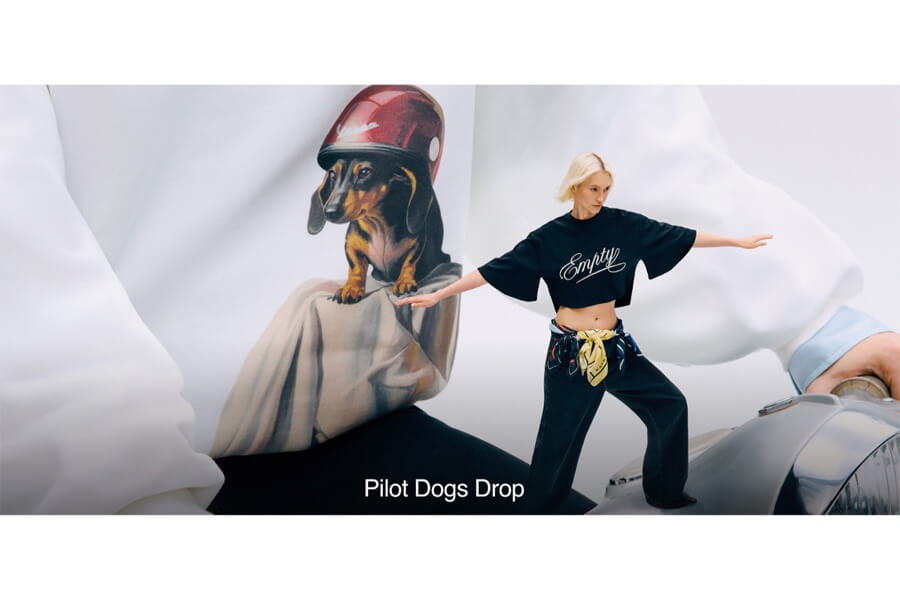 Protagonista è il Bassotto, mascotte ironica e inclusiva, protagonista di t-shirt, felpe e camicie con grafiche pop, oltre a un esclusivo jeans wide-leg con incisioni laserate bianche. I Pilot Dogs animano anche stampe all-over effetto second skin, creando una narrazione corale e giocosa.