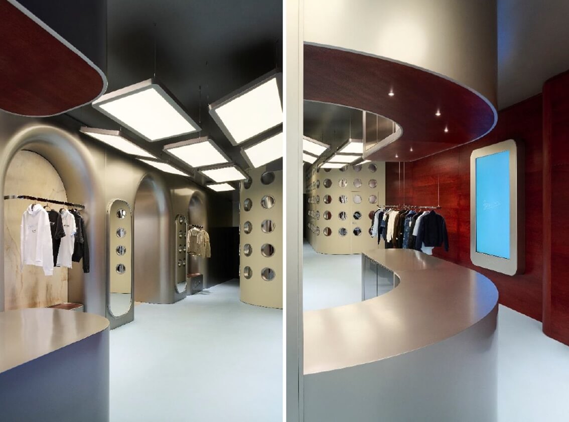Il concept store VESPA THE EMPTY SPACE ridisegna così il confine del marchio Vespa, senza vincoli, senza troppe regole, reinterpretandolo in chiave innovativa e contemporanea. L’architettura e il design si ispirano al linguaggio Vespa: nessuna linea retta, nessuno spigolo, ma pareti curve in acciaio satinato che richiamano la scocca metallica del veicolo di culto italiano. La pavimentazione industriale evoca il mondo delle officine, mentre le superfici in rovere definiscono un ambiente caldo, portando stile e personalità.
