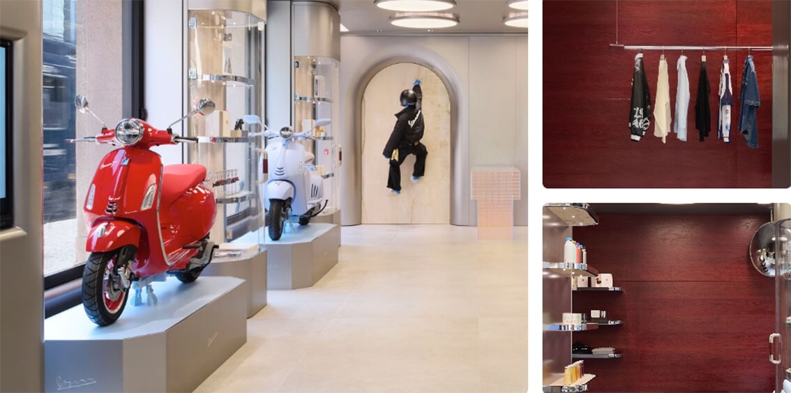 Il Vespa Café occupa un ruolo centrale dello spazio, un luogo d’incontro che richiama lo spirito libero e conviviale del brand, con un menù su misura che interpreta la filosofia spensierata di Vespa. Lo store si sviluppa in tre aree: una con una selezione delle Vespa più iconiche, simboli di design e libertà su due ruote; una dedicata alla moda, con collezioni uniche che riflettono personalità e stile individuali; e infine una sezione lifestyle, dove oggetti da raduno vengono rivisitati in chiave pop. Un invito a immaginare Vespa in tutte le sue forme, dentro e fuori la strada.
