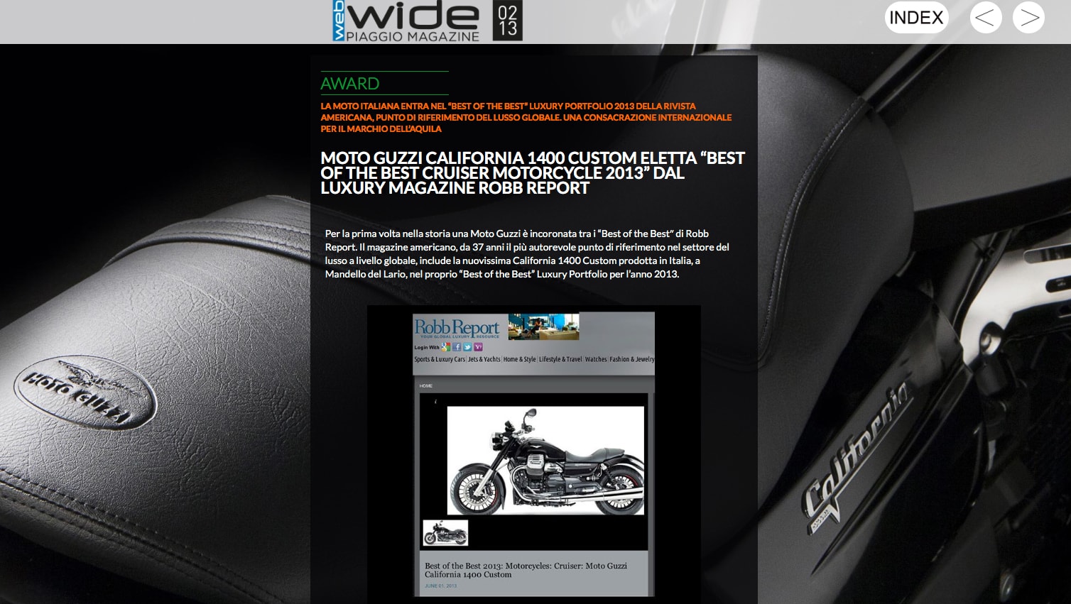 A maggio 2013 Robb Report, magazineamericano che è il più autorevole punto di riferimento nel settore del lusso a livello globale, include la grande Custom nel proprio Best of the Best Luxury Portfolio per l’anno 2013, e ad agosto un altro importante riconoscimento arriva sempre dagli Stati Uniti, la California 1400 conquista il primo premio della categoria Cruiser nel concorso indetto da Cycle World.