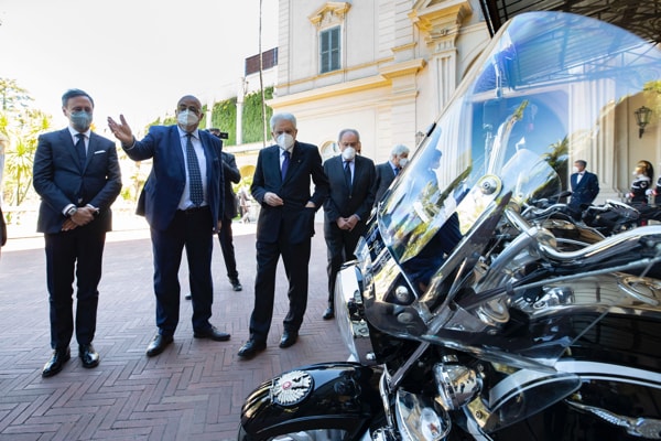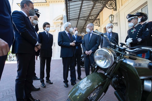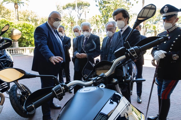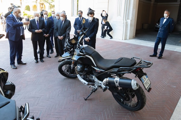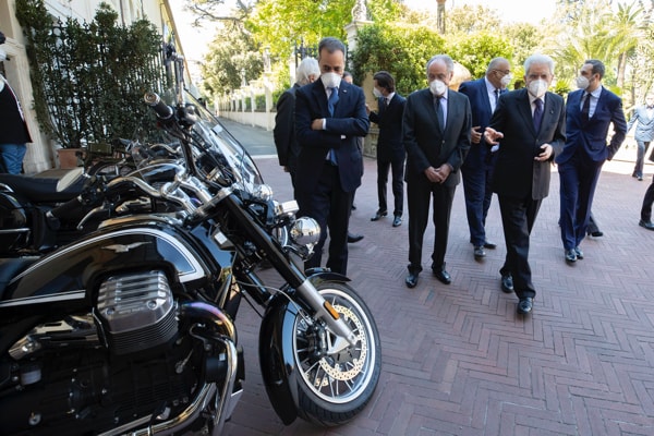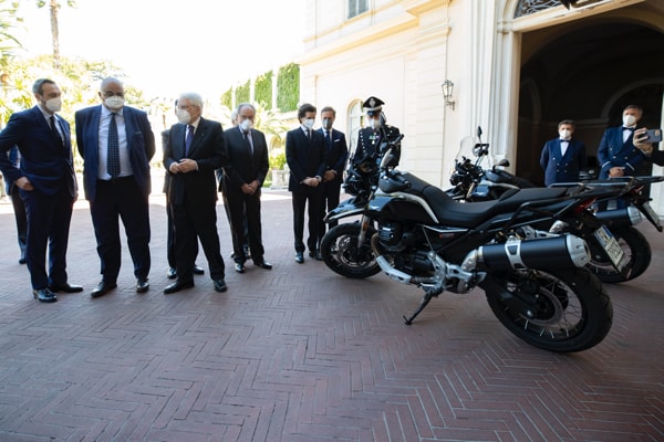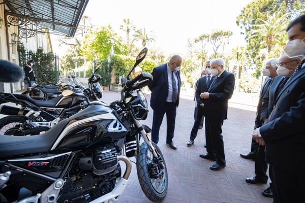 Roma, 20 Maggio 2021 - In occasione del 100° anniversario della Moto Guzzi, sono state presentate al Presidente della Repubblica, Sergio Mattarella, questa mattina al Palazzo del Quirinale, due nuove "Moto Guzzi V85TT" destinate al Reggimento Corazzieri.