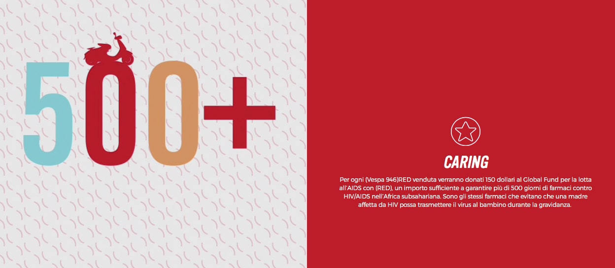 (RED), che ha Vespa tra i suoi partners, attraverso la vendita dei prodotti di grandi brand internazionali, ha contribuito al rifinanziamento del fondo globale con 150 milioni di dollari. Vespa sostiene (RED), supportando quindi il Global Fund, unendo i suoi consumatori nella battaglia contro l’AIDS. Per ogni Vespa 946 customizzata (RED) venduta, 150 dollari sono donati all’organizzazione internazionale (sito web: www.red.org), una cifra atta a garantire più di 500 giorni di farmaci contro HIV/Aids nell’Africa subsahariana. Farmaci fondamentali che evitano che una madre affetta da HIV possa trasmettere il virus al bambino durante la gravidanza.