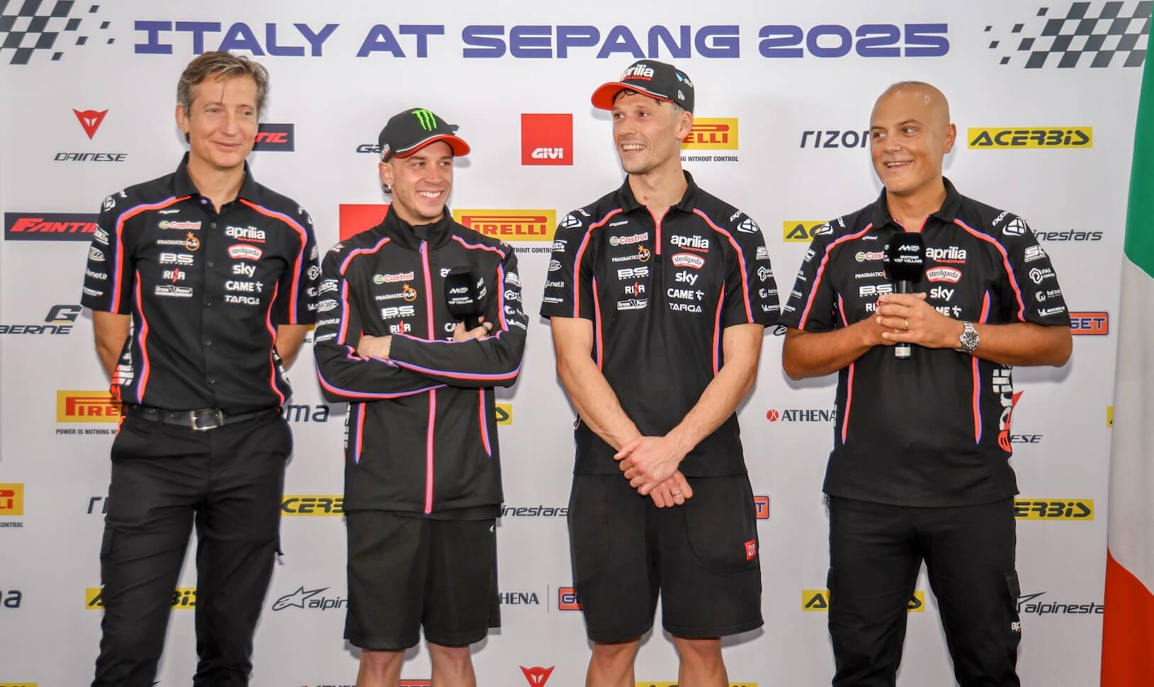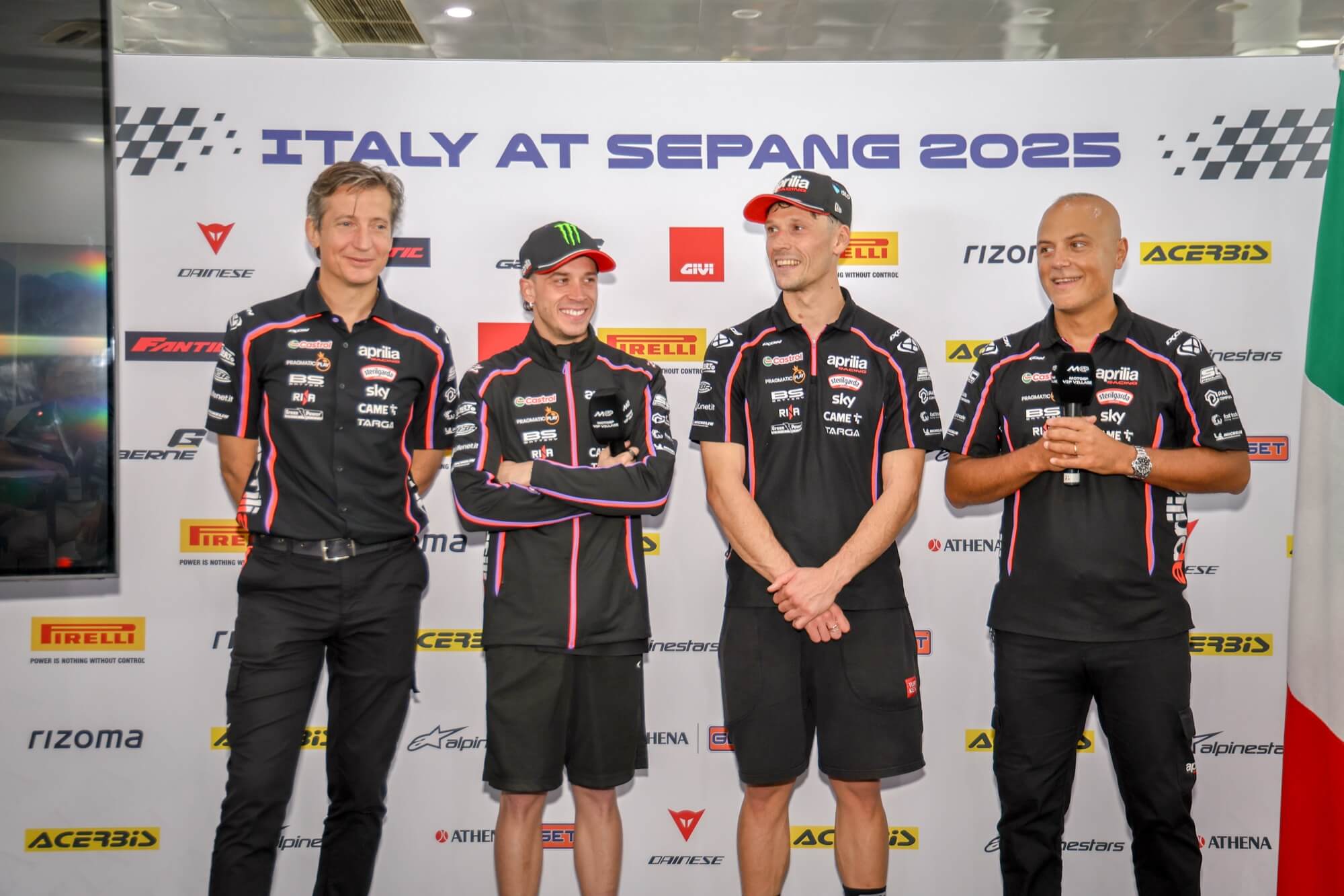 Il team Aprilia Racing, in rappresentanza del Gruppo Piaggio: da sinistra, Massimo Rivola (CEO Aprilia Racing), i piloti Marco Bezzecchi e Lorenzo Savadori, Antonio Boselli (Head of Motorsport Communication).Photo courtesy FMI.